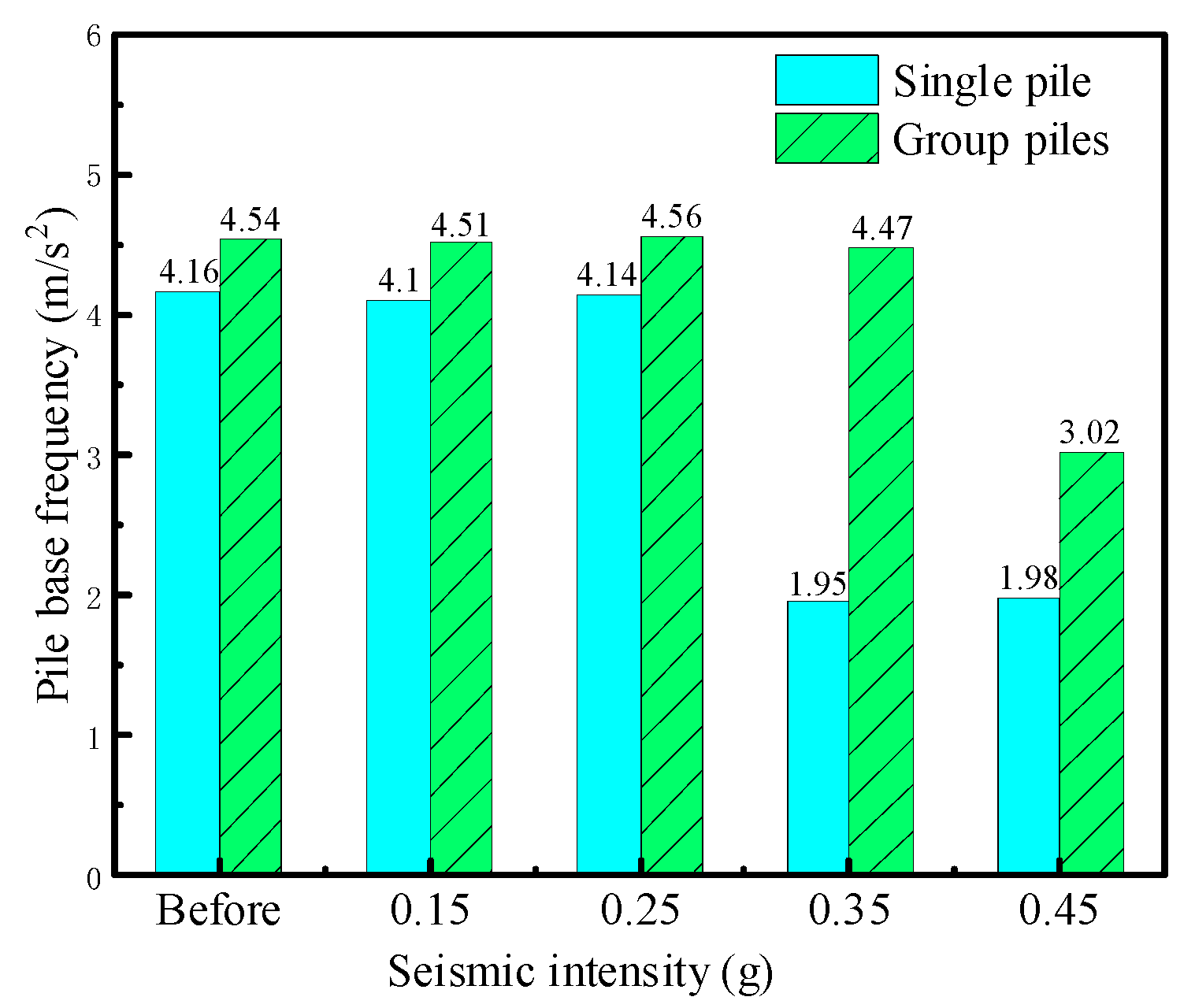 Fourier spectrum analysis reveals that the fundamental frequency of the single pile drops sharply at 0.35 g (by 52.90%), indicating structural damage. In contrast, the pile group remains stiff until 0.45 g, with only a 32.44% reduction in stiffness.