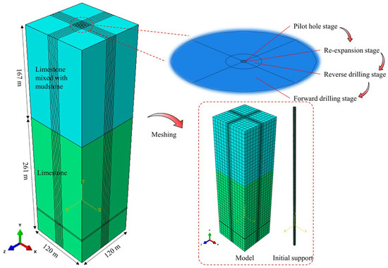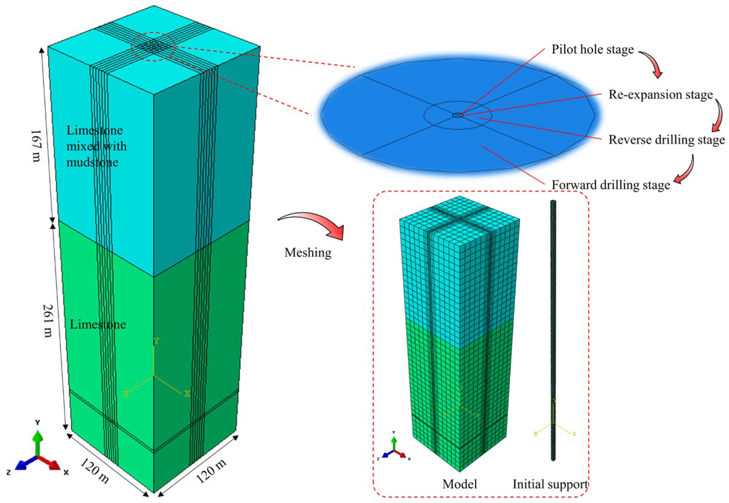 Based on the results of detailed geological investigations conducted on site, a corresponding geometric model was established. According to the borehole data, the geological profile along the shaft alignment consists of limestone interbedded with mudstone from 0 to 167 m, and transitions to massive limestone from 167 m to the bottom depth of 428 m. The RBM construction process was modeled in the following sequential stages: pilot hole drilling, reaming, forward drilling and reverse drilling. To ensure the generation of a high-quality and regular mesh, the circular excavation area at the center of the shaft was first discretized. This was followed by meshing of the entire model domain based on the initial subdivision, thereby improving element uniformity and computational stability. A total of 41,974 elements and 47,520 nodes were generated in the model. The 3D geometry and mesh layout of the model are shown in