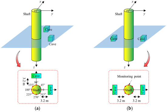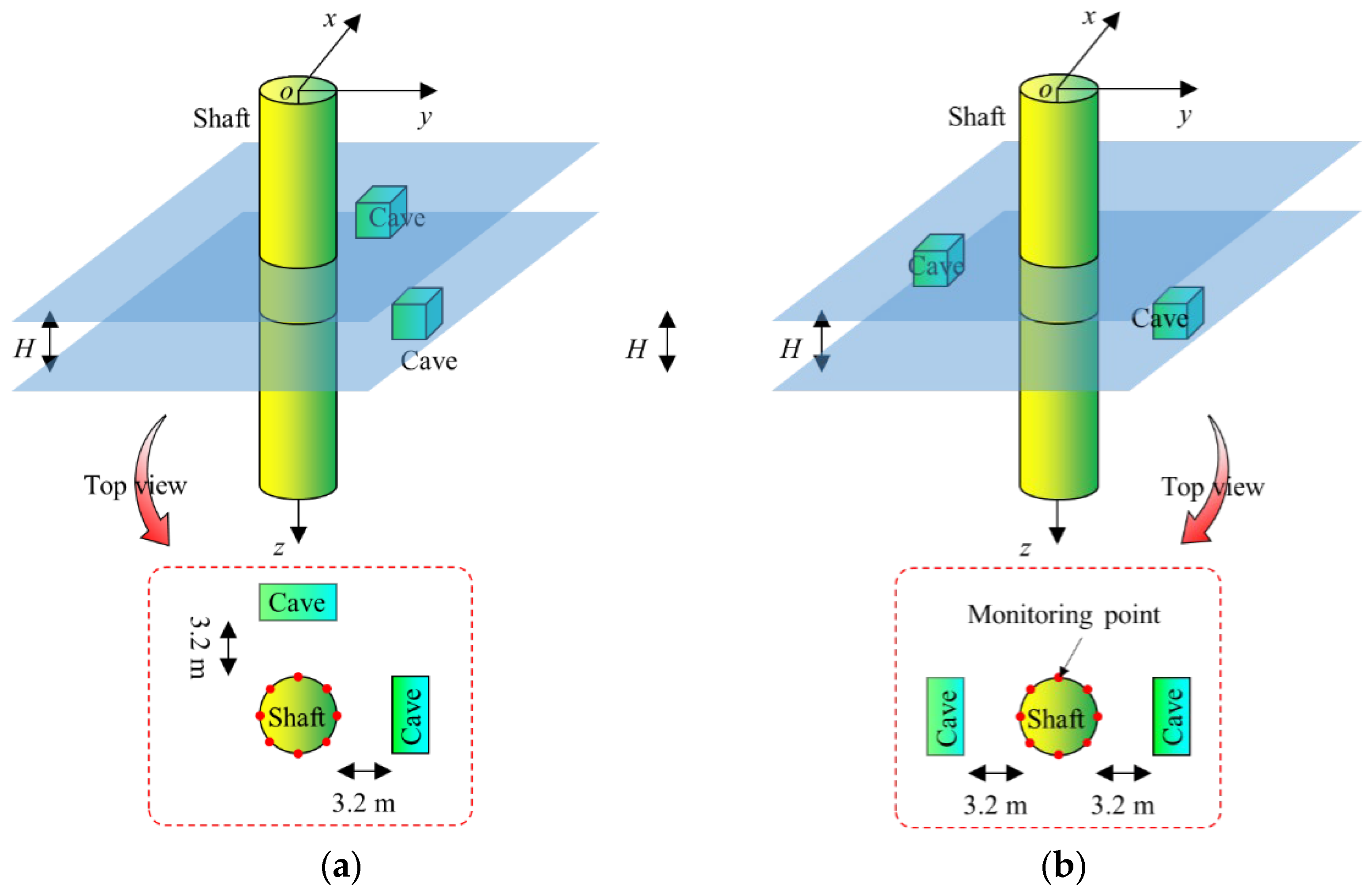 The present study investigates the impact of two karst cavities on the stability of the surrounding rock during shaft excavation. Initially, the scenario where the two cavities lie in the same horizontal plane, with configurations of vertical alignment and symmetric distribution, was analyzed. The corresponding geometric layout is illustrated in