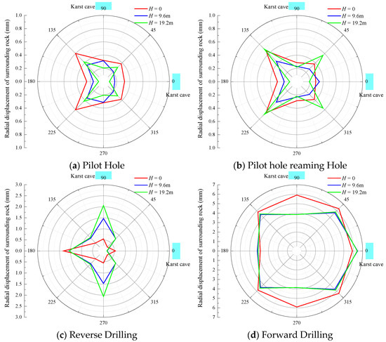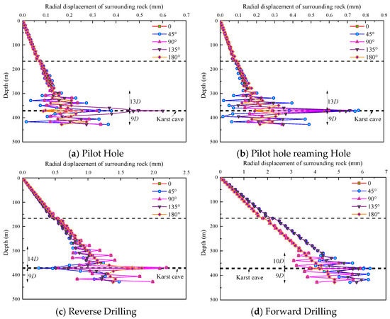 In terms of spatial distribution, the maximum displacement occurs at 135°. These findings indicate that under the influence of symmetrical cavities, the reverse reaming stage technique can effectively control deep surrounding rock deformation compared to the forward reaming stage method in karst formations with symmetrical cavities.