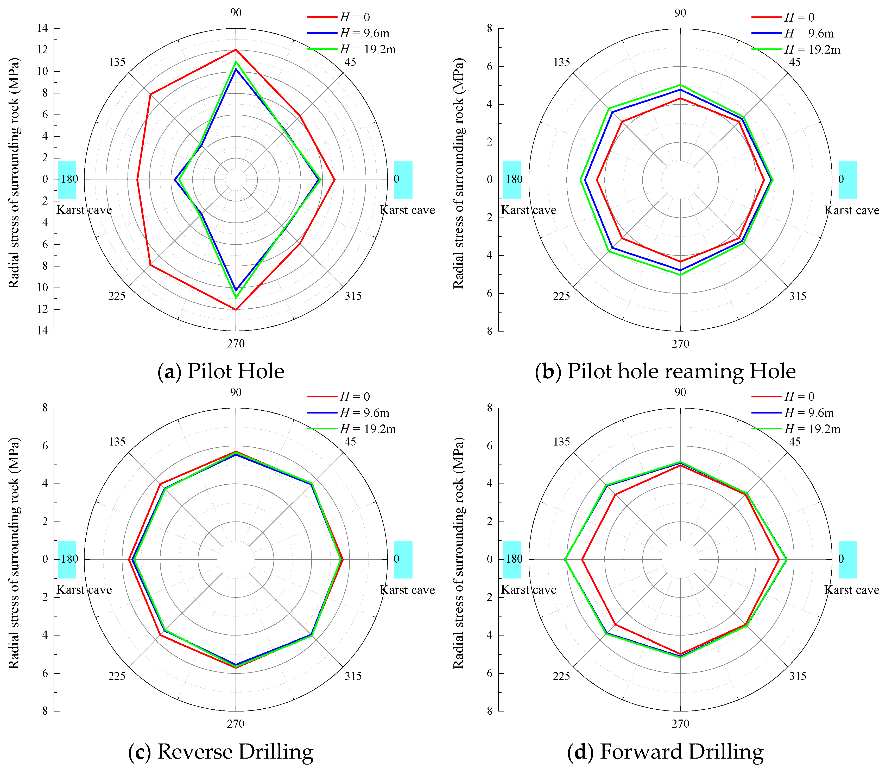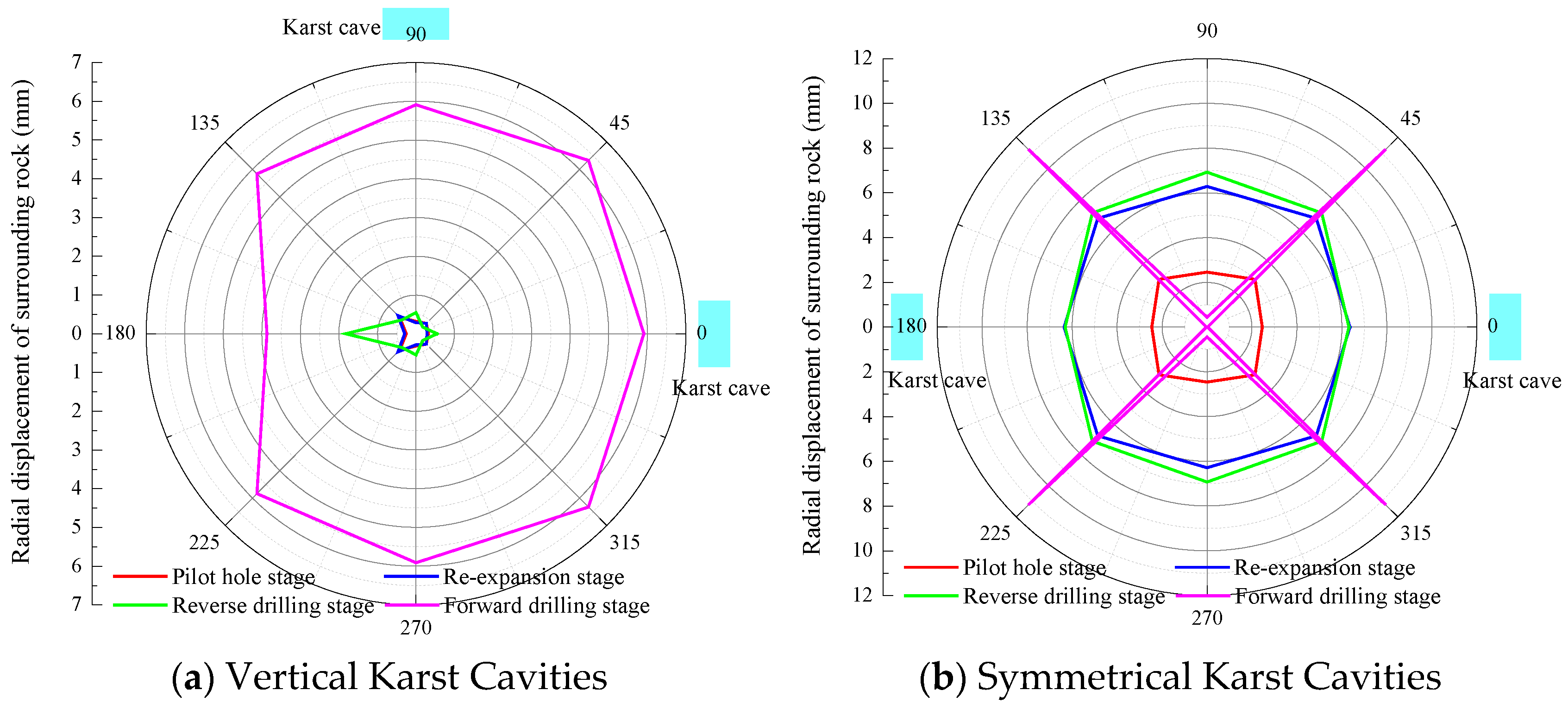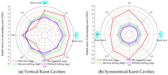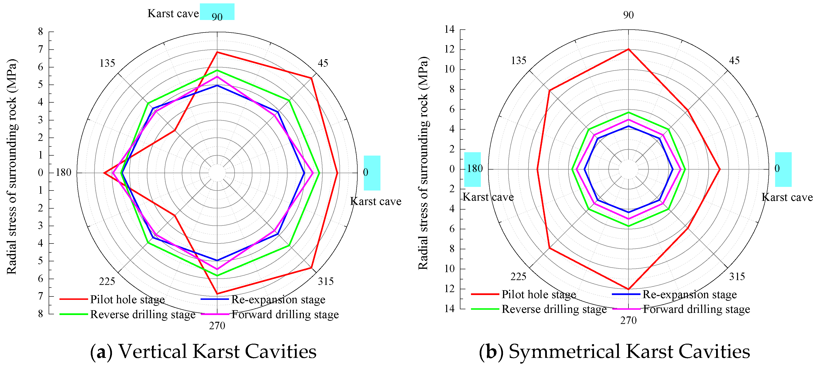 Figure 11a,b, the following conclusions can be drawn: During reaming, particularly in the reaming and forward reaming stages, the radial stress of the surrounding rock is markedly affected. This impact is more significant in the presence of symmetrical cavities, likely due to the complex geological structure associated with such formations.