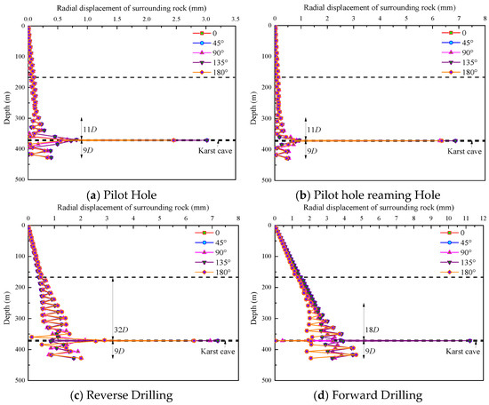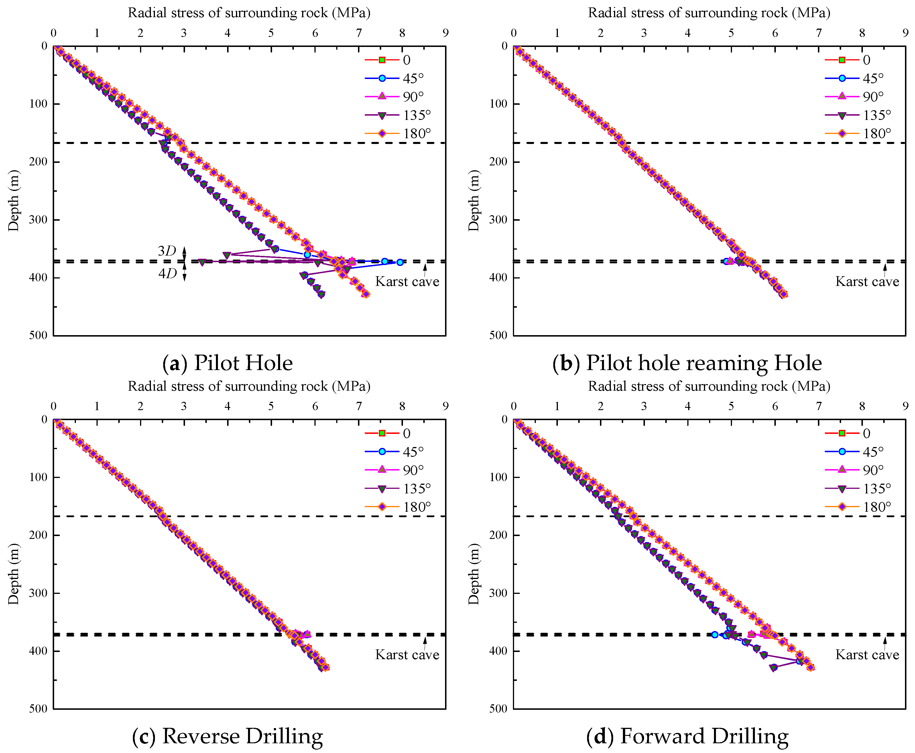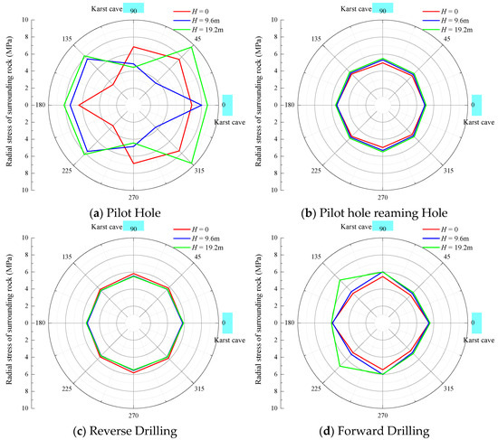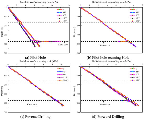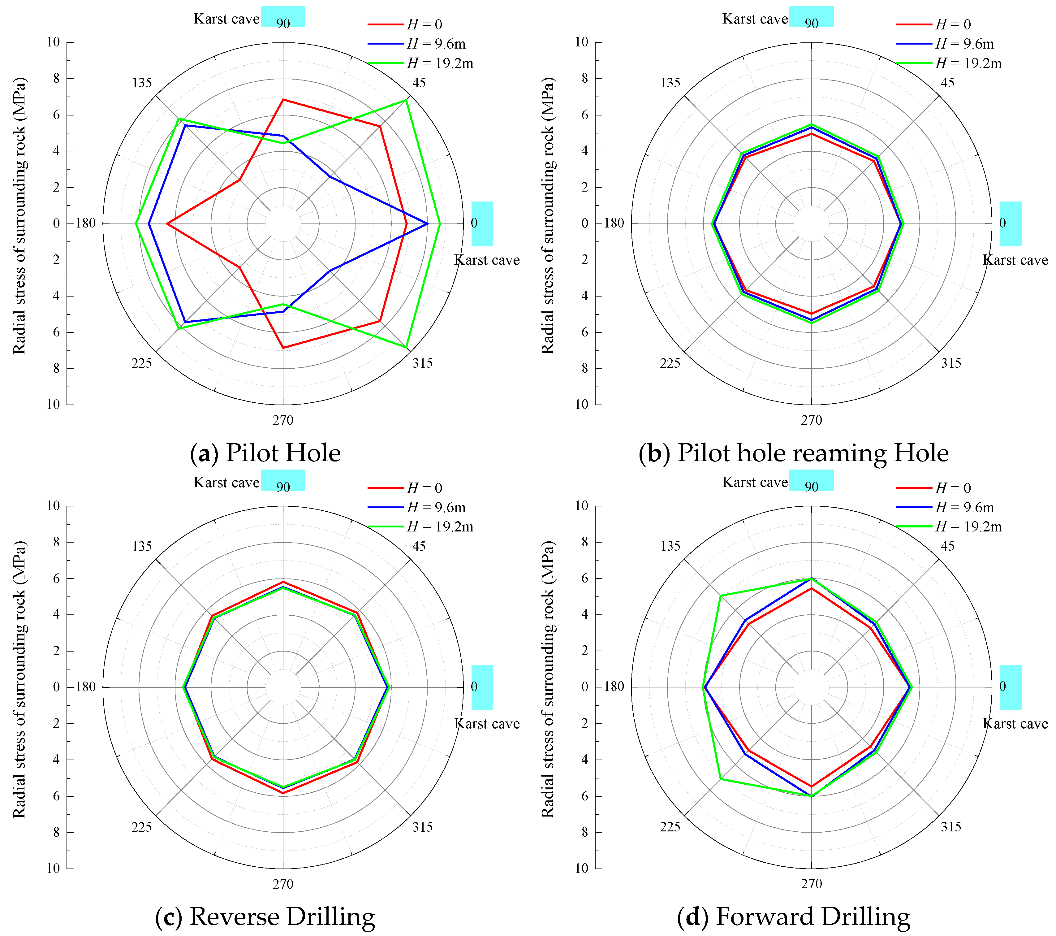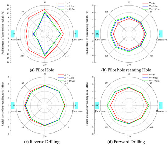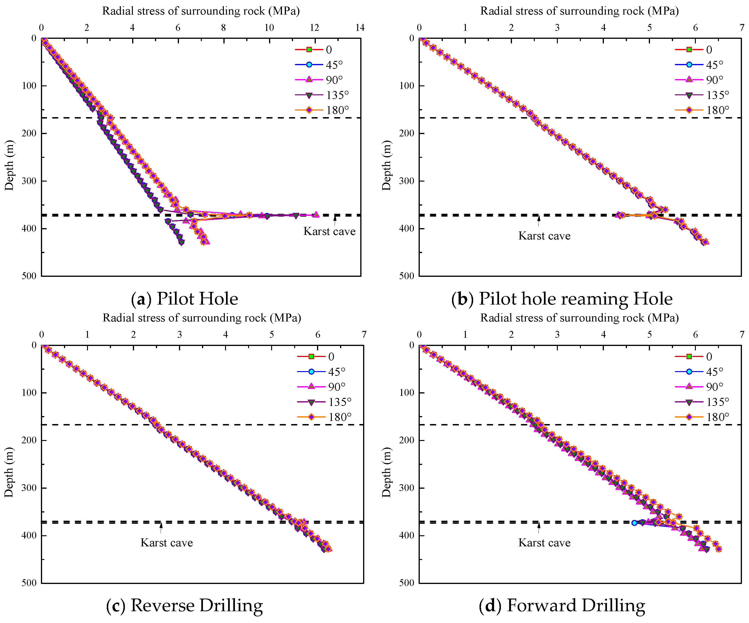Figure 11a,b, the following conclusions can be drawn: During reaming, particularly in the reaming and forward reaming stages, the radial stress of the surrounding rock is markedly affected. This impact is more significant in the presence of symmetrical cavities, likely due to the complex geological structure associated with such formations.