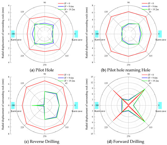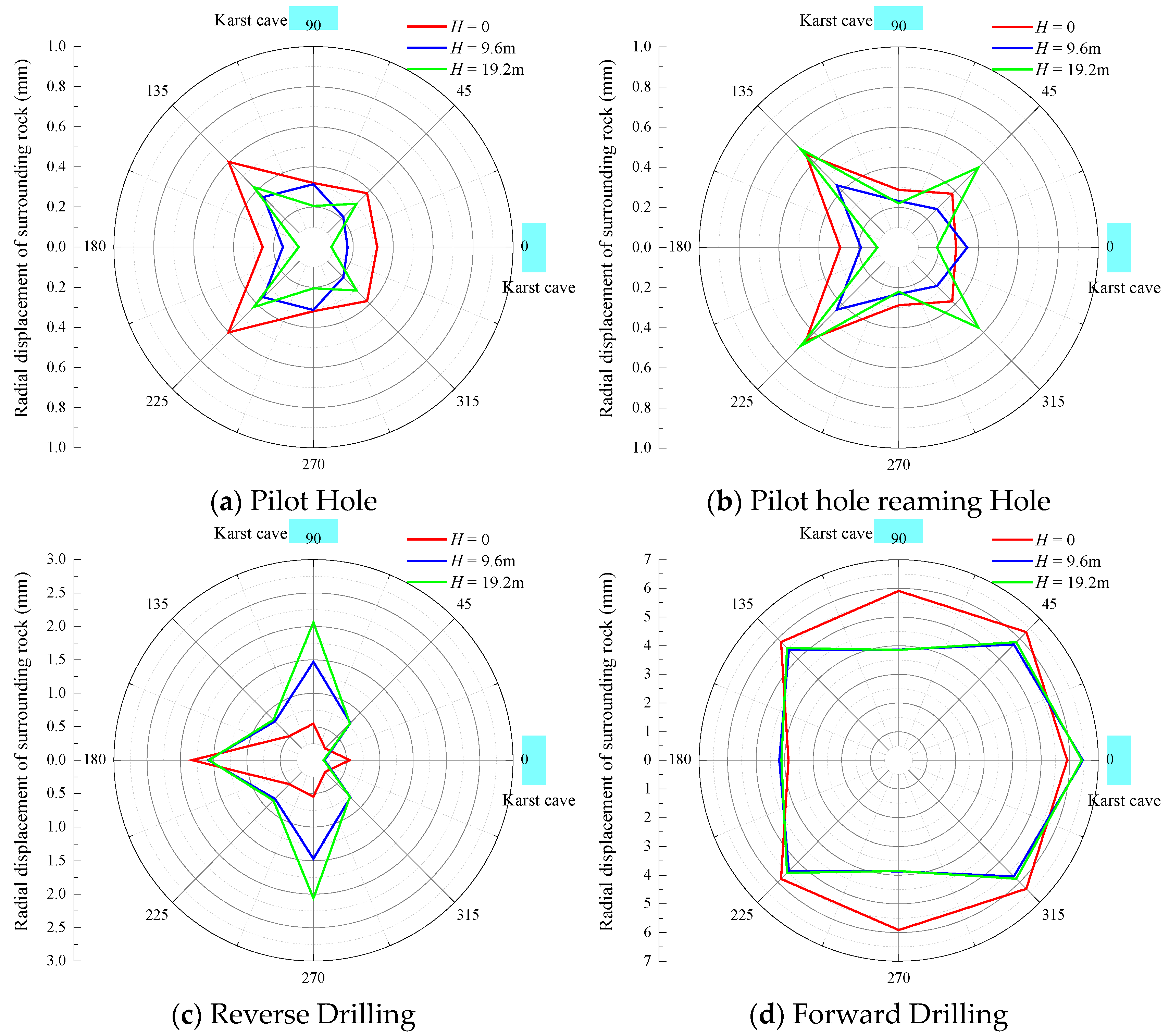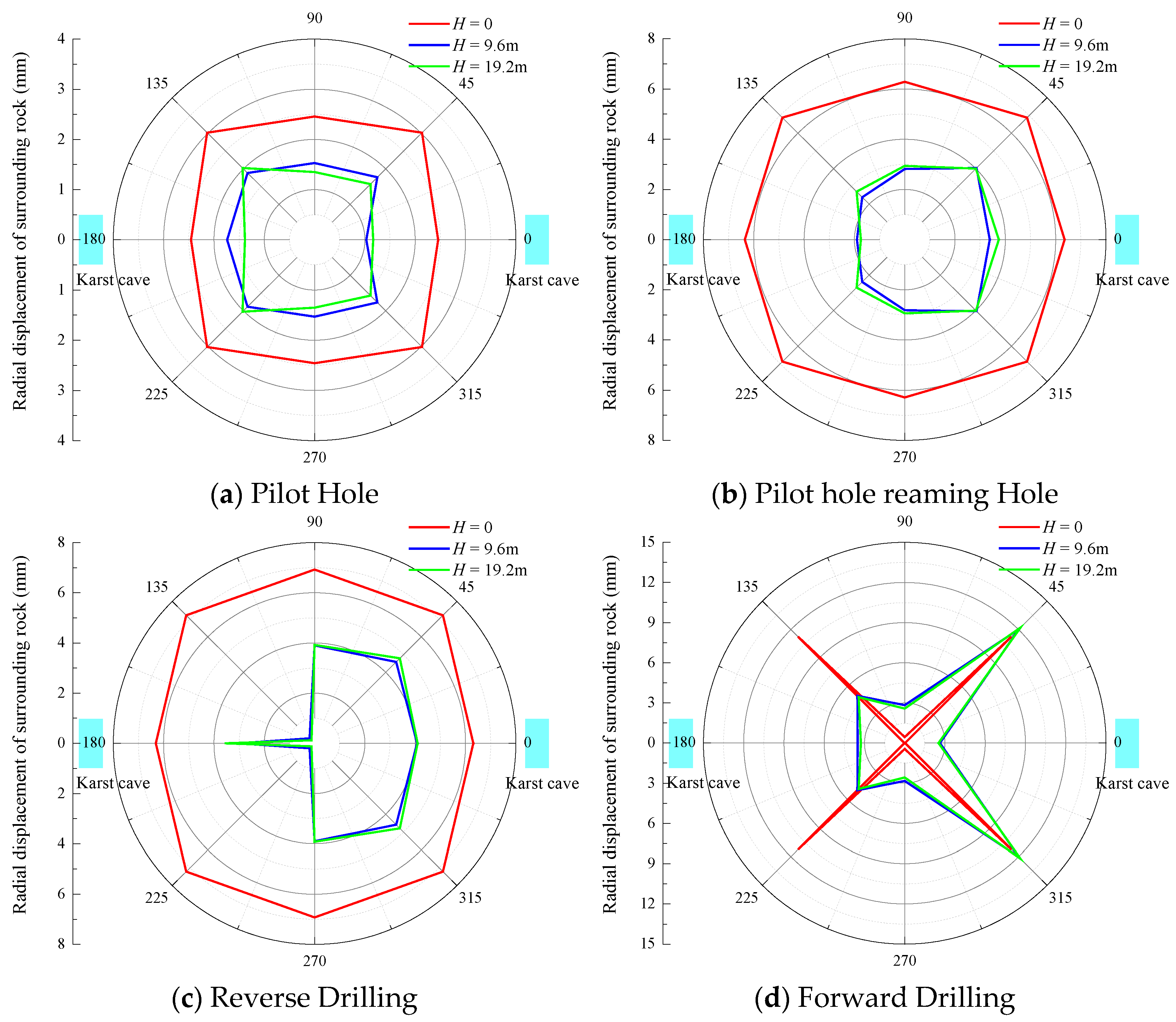 Under these conditions, the radial displacement of the surrounding rock changes only slightly during the pilot hole and reaming stages. However, during the forward reaming stage, the radial displacement increases significantly, exceeding that observed during the reverse reaming stage and representing the maximum displacement among all four excavation methods. This finding indicates that the forward reaming stage causes the most severe damage to the stability of the surrounding rock during the excavation of vertical cavities located on different planes. Therefore, enhanced monitoring and reinforcement measures are required during this stage to ensure construction safety.