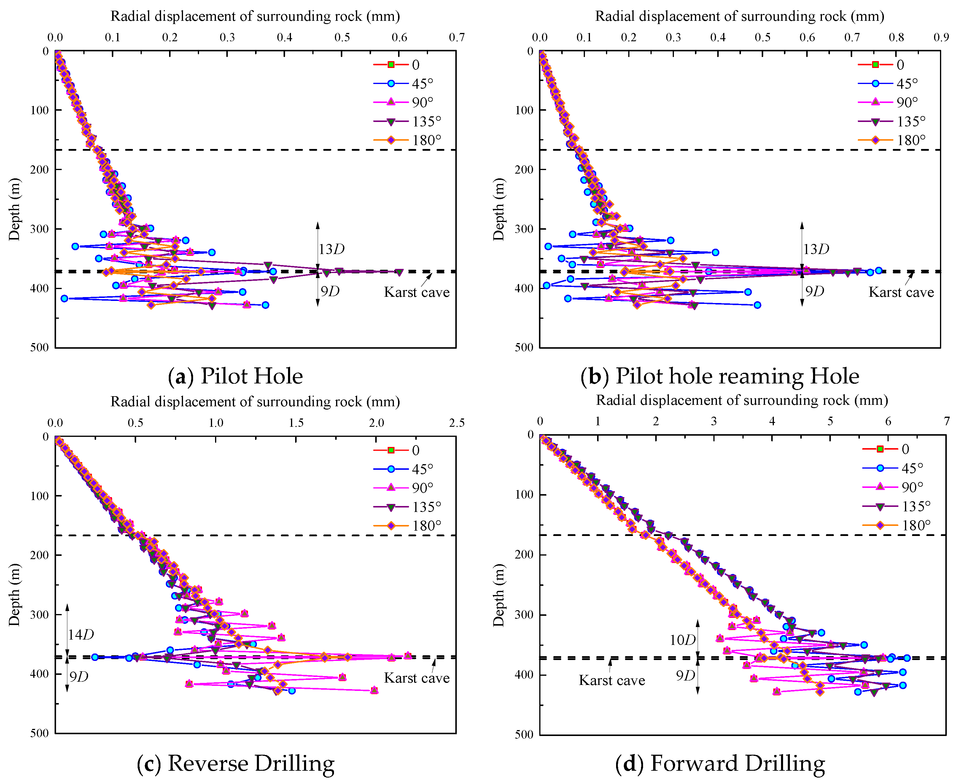 Figure 8, the radial displacement of the surrounding rock increases progressively with reaming depth across all four construction stages in the numerical simulation, with peak displacement occurring at the locations of the karst cavities. The maximum radial displacement during the reverse reaming stage at the cavity zone is approximately 7 mm, which is smaller than that observed during the forward reaming stage (11 mm). This reduction is attributed to the bottom-up excavation sequence effectively mitigating stress concentration around the cavity boundaries, consistent with actual construction observations. Furthermore, the radial displacement during the pilot hole stage is significantly smaller than that during the subsequent reaming stages. This is primarily due to the influence of symmetrically distributed cavities, where the in situ stress maintains a symmetric spatial distribution during the pilot hole stage, thereby preserving the overall stability of the surrounding rock.