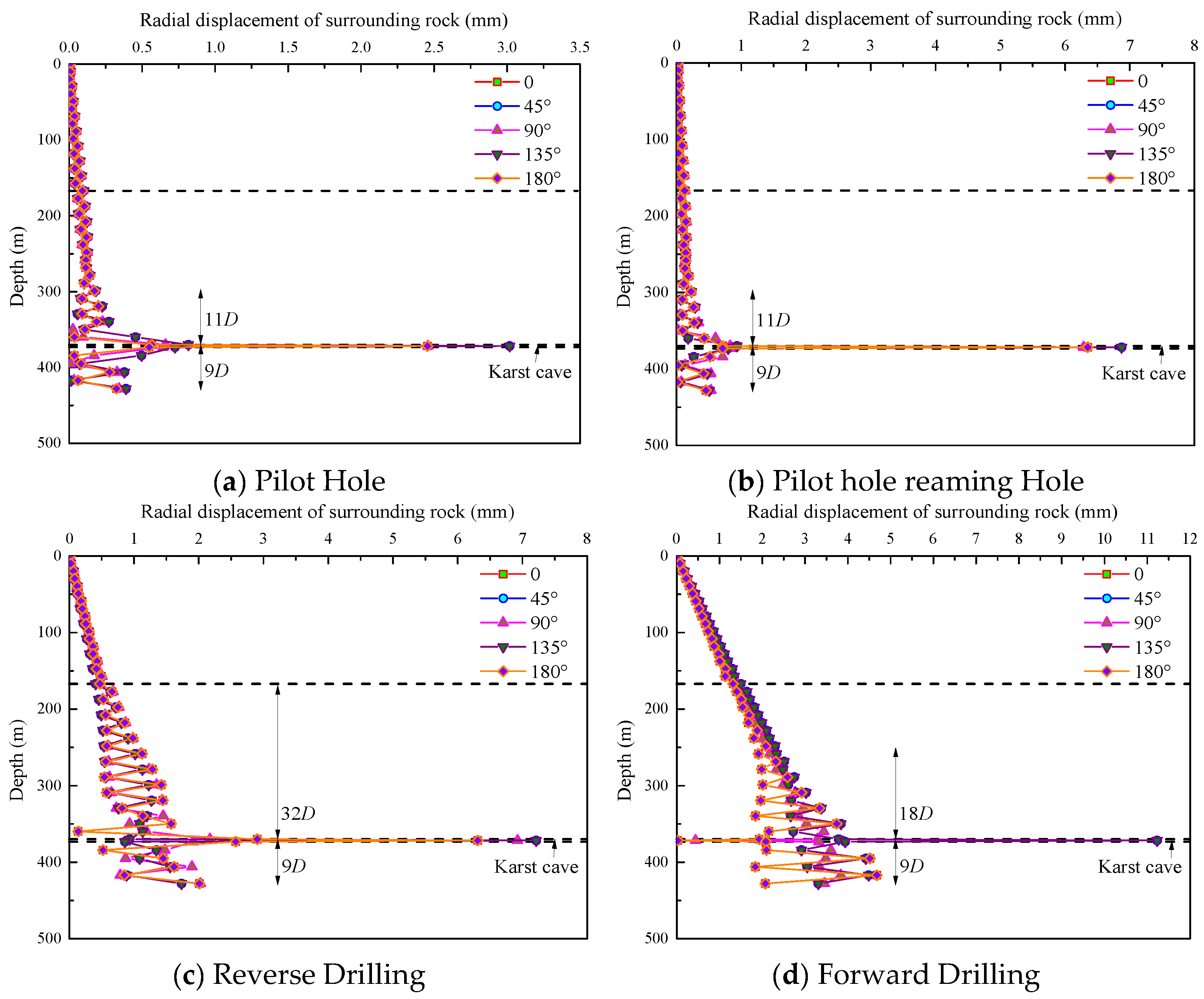By conducting a full-process simulation of the shaft excavation using the Raise Boring Machine (RBM) method, the variation in radial displacement of the surrounding rock with depth under the influence of vertically aligned karst cavities was obtained. The results for different orientations around the shaft are shown in