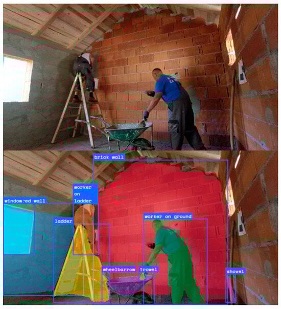 AI object detection in plastering operations. Top: original site image. Bottom: labeled segmentation (generated using the tested multimodal AI).