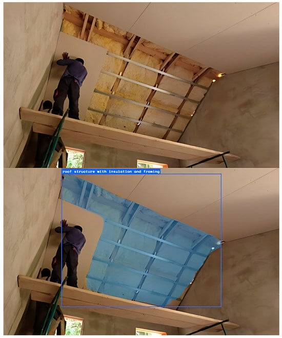 AI object detection in roof insulation operations. Top: original site image. Bottom: labeled segmentation (generated using the tested multimodal AI).