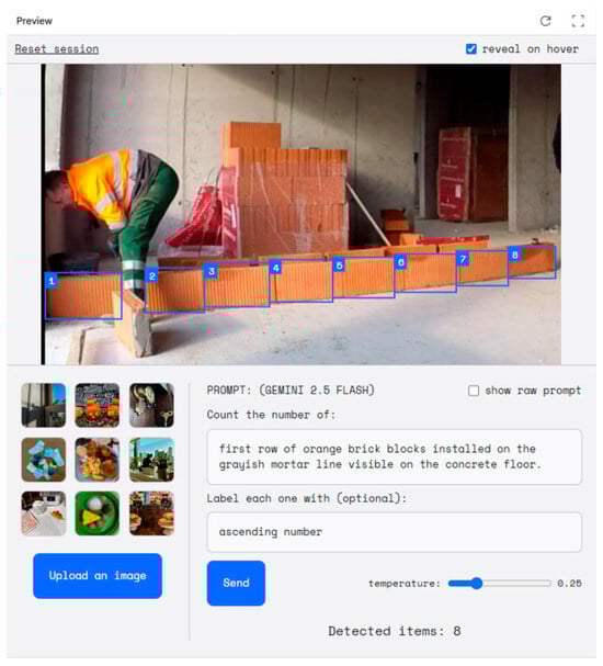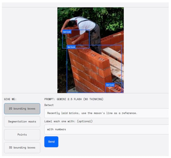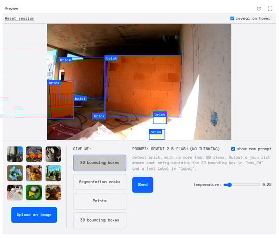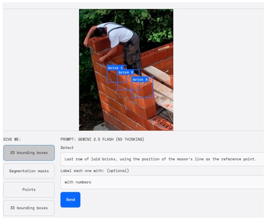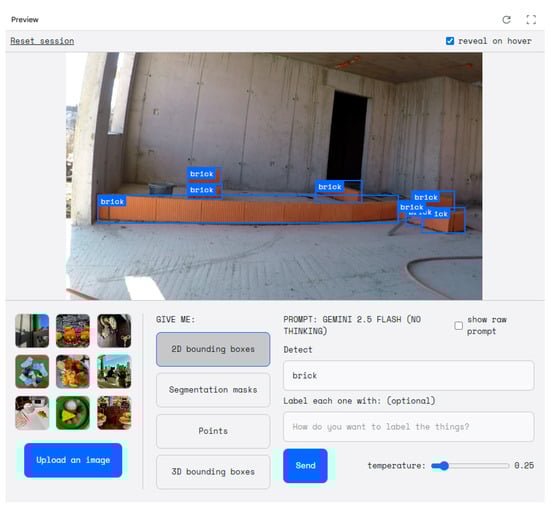 For the purposes of this research, Google AI Studio’s Gemini 2.5 Flash model was selected for its widespread availability to all interested parties. In addition, Gemini 2.5 Flash was preferred over alternatives because it offered readily available vision-based starter apps within the Google AI Studio platform. Custom-trained AI vision models were not considered appropriate for this study, as the objective was to benchmark a general-purpose model rather than develop a bespoke algorithm. No formal comparative benchmarks were conducted, as the study’s focus was on assessing the feasibility of a readily available off-the-shelf multimodal AI for construction-specific tasks.