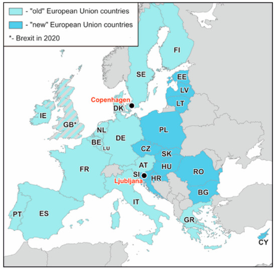 Case studies were selected by applying the method of purposive sampling [83], which is typically used in pilot and comparative studies [10,84,85]. For the purpose of this research, four case selection criteria were identified: (1) winning the European Green Capital Award (hereinafter: EGCA); (2) signing the Circular Cities Declaration (hereinafter: CCD); (3) membership in the European Union, and (4) capital function. Two capitals were selected—the first from the so-called “old European Union” (Copenhagen, Denmark) and the second from the “new European Union” (Ljubljana, Slovenia). The countries of the so-called “old Union” are the founding countries of the Community (under the 1957 Treaty of Rome) and those that joined the EU between 1973 and 1995. The countries of the “new Union” are those from the former socialist bloc that joined the EU between 2004 and 2013 (Figure 1). This selection increases the comparative value of the study due to the possibility of demonstrating the relationship between the length of time since accession to the EU and the level of CE implementation. The appropriateness of the choice is confirmed by the fact that Ljubljana and Copenhagen are the only two EU capitals that have been invited by the Ellen MacArthur Foundation to become members of the Circular Cities Network.