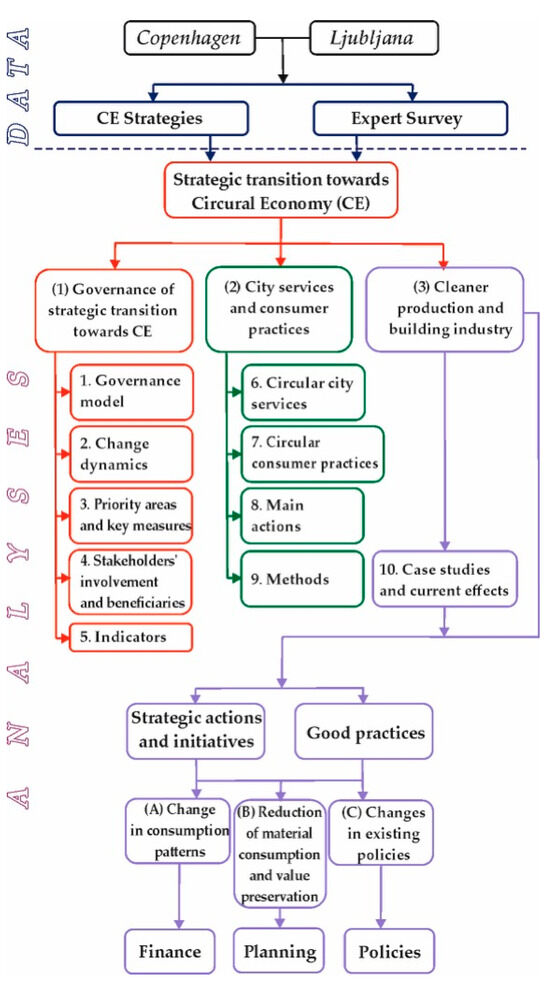 The study was structured with reference to previous studies of the circular economy and the most relevant threads recognized on this basis. Responses to the research questions were organized according to the current trends in approaches to adapting the circular economy to the built environment. First, the governance for sustainable cities was examined in order to determine the most significant strategic goals, measures, and actors involved in the implementation process. Second, the paper recognizes urban services and consumer practices adapted to the circular economy that enabled us to broaden the spectrum of undertaken actions. Then, cleaner production and construction—understood as a preventative strategy focused on resource efficiency and minimizing waste at the source—was investigated to identify good practices and the current impact of implemented circular strategies. As a foundational element of the CE, this concept addresses the efficiency of production processes before materials enter the use cycle, thus helping to outline the prospects for a fully circular built environment [13,14,15,16,17].