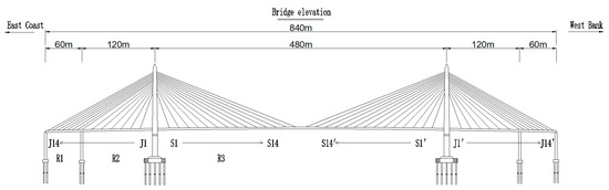 The Zhanjiang Bay Bridge is a double tower double cable plane hybrid beam structure, using a five-span continuous semi-floating system with spans of 60 m, 120 m, 480 m, 120 m, and 60 m, respectively. The whole bridge is 840 m long. The main beam is a reinforced concrete structure. The main beam is a composite of steel and concrete, with concrete beams positioned at both ends of the span and a steel box beam in the middle. The cable bent tower is a reinforced concrete construction, with a height of 155.1 m above the supporting platform and 113.8 m above the bridge deck. The double cable surface fan-shaped arrangement in the cable space is made of low relaxation high-strength epoxy coated steel strands with a diameter of 15.24 mm, a strength of Ry = 1860 Mpa, and covered with HDPE protective layer. The horizontal spacing between the two cable surfaces on the bridge deck is 27.7 m, the cable spacing of the inclined cable on the longitudinal steel box beam is 16 m, and the cable spacing on the side span concrete beam section is 8 m. There are 112 cables for the whole bridge, with 56 cables on one side. The cable numbers are defined from east to west, with the left-side cables sequentially labeled J14 to J1 and S1 to S14 and the right-side cables labeled S′14′ to S1′ and J1′ to J14′. The cable-stayed bridge’s general layout is illustrated in Figure 1.