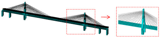 Firstly, a 3D model of the cable-stayed bridge is created in ANSYS. The main beam, bridge tower, and piers are modeled using Beam4 spatial beam elements, and rigid arm extensions are used to connect the main beam to the cables. The cable is simulated using a rod element Link10, and the prestressing of the cable is achieved by setting the initial strain. The anchorage points of the diagonal cables are the natural nodes of the beam elements, and the beam element nodes and cable nodes are connected by rigid connecting rods. The upper dead load of the bridge is discretized into additional nodal masses on a finite number of nodes, the torsional stiffness of the main beam, bridge tower, and pier is simulated using the mass moment of inertia, and structural mass is applied on the nodes using mass element MASS21. The main tower is constructed from reinforced concrete, and the bridge tower is divided into 7 sections for simulation based on the bridge’s geometric data. The main beam, bridge tower, and piers are modeled with constraints that match the actual design of the bridge. The material parameters for each component are detailed in Table 1 and the finite element model is shown in Figure 2.