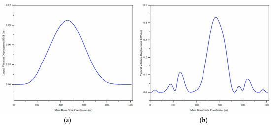 Based on meteorological observations and specialized wind studies, the average wind speed of Typhoon “Mujigae” at the site is 50 m/s. The bridge deck wind field is numerically simulated using MATLAB 2024, with a span of L = 840 m, beam height z = 50 m, ground roughness coefficient 0.12, and average wind speed at beam height U(z) = 50 m/s. In the simulation, all action points corresponded to finite element nodes, resulting in 158 wind speed time-history points. The converted buffeting force time histories and static wind loads are applied to the finite element model in ANSYS 2019 using transient dynamic analysis, yielding the bridge’s time-history response under typhoon. Displacements are generated in along-wind, cross-wind, and vertical directions. Root-mean-square (RMS) values of displacement are calculated for each node to quantitatively evaluate positional behavior. Figure 3 shows that RMS values of along-wind and vertical displacements along the main beam are approximately symmetric, decreasing from mid-span toward the supports. Peak RMS values occur at mid-span, indicating that the dynamic response is most pronounced in this region.