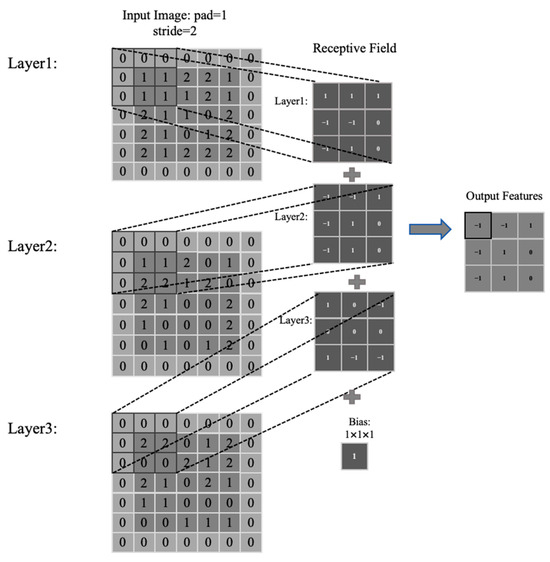 Convolutional layers are employed to extract local features from input data and comprise multiple convolutional kernels. Each kernel slides across the input data and performs convolution operations within corresponding regions to extract features. The operational process of convolutional kernels is shown in Figure 5. Parameters of convolutional layers include kernel size, stride, and padding, which collectively determine the dimensions of output feature maps produced by the convolutional layer. The expression is given as follows: