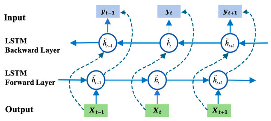 BiLSTM consists of layers operating in two transmission directions: a forward layer that processes information sequentially along the time series, and a backward layer that processes information in reverse chronological order. This architecture enables comprehensive extraction of both historical and future contextual information from time series data. The structure is illustrated in Figure 7. The forward layer processes the sequence chronologically to encode historical information, while the backward layer processes the sequence in reverse to encode future information. The output layer combines the bidirectional hidden states to produce the final output, with the mathematical expression given as follows: