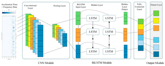 Through the synergistic combination of CNN-based spatial feature extraction and BiLSTM-based temporal dependency modeling, the CNN–BiLSTM framework fully exploits potential features of acceleration signals in both the time-frequency and time-series domains, thereby achieving accurate and reliable identification of cable damage states in cable-stayed bridges. The process flow of this identification method is illustrated in Figure 8.