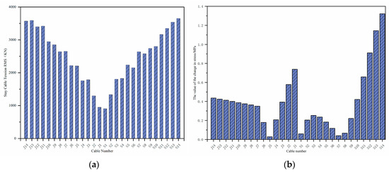 Due to the symmetrical distribution of geometric information of cable-stayed bridge, the east bank side of cable-stayed bridge is selected for analysis in this paper. The locations of cables most vulnerable to damage under typhoon are determined through analysis of main beam displacement and cable stress variations. A numerical simulation is conducted using a time step of 0.1 s for 600 s time history analysis, yielding 6000 sets of time history data for each cable. The root-mean-square (RMS) values of each cable force are calculated based on the 6000 sets of cable force data, as presented in Figure 9. Figure 9a reveals that the RMS of cable stress exhibits a positive correlation with the RMS of main beam-anchorage node displacement. The bank of the cable-stayed bridge is divided into three areas (R1, R2, R3) by three piers. It can be seen from Figure 9b that under the typhoon, in R3 area, the main beam has a large displacement in the middle of the span, and the stress amplitude of the cables (S14, S13 and S12) near the middle of the span is greater than that of other locations. In this area, cables S14, S13 and S12 are more prone to damage. In R2 area, the displacement at the main beam node 87–97 (corresponding to the cable numbers J1 and J2) is locally the largest, and the stress amplitude of the cable is also relatively large in this area, where the cables J1 and J2 are more prone to damage. In R1 area, due to the influence of support constraints, the displacement in this area is small. So, it is mainly analyzed from the change in stress. In this area, the stress changes evenly, and the longest side span cable J14 changes the most, in R1 area, cable J14 is the most vulnerable to damage. Through analysis of main beam displacement and cable stress changes, this paper determines that the six cables that are most prone to damage under the typhoon load are S14, S13 and S12 in R3 area, J2 and J1 in R2 area, and J14 in R1 area.