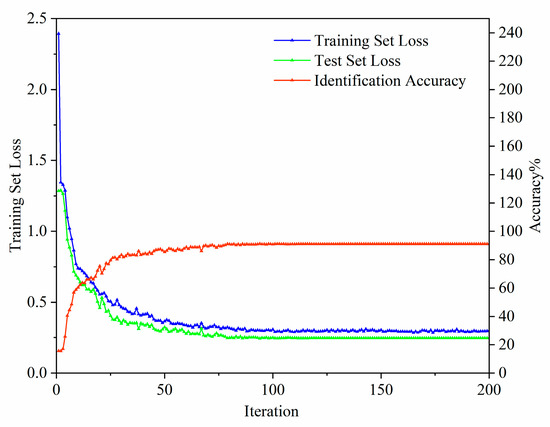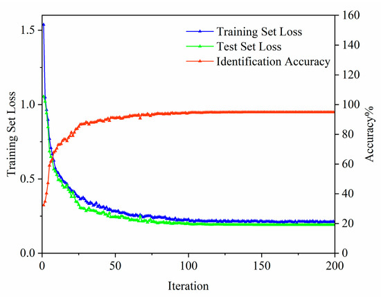 A hybrid CNN–BiLSTM model is developed by integrating the spatial feature extraction capability of CNN with the temporal sequence learning advantage of BiLSTM. The front-end consists of three convolutional layers, and the back-end incorporates two bidirectional BiLSTM layers to capture temporal dependencies in the extracted feature sequences. The input feature space is constructed from the Hilbert-transformed time–frequency features derived from the acceleration responses of six monitored cable anchorage nodes. The corresponding input tensor has dimensions of 1799 × 406 × 6, representing time steps, sample number, and monitored cables, respectively. In the CNN component, 32 convolutional filters (kernel size = 3, stride = 3, padding = 1) are used, followed by ReLU activation and a 2 × 2 max-pooling layer for dimensionality reduction. The extracted spatial features are flattened and passed to the BiLSTM layers, each containing 256 hidden units, where bidirectional temporal dependencies are modeled. The output layer maps the learned temporal features to a six-dimensional vector corresponding to the damage-degree factors of the six target cables. The model is trained using Smooth L1 Loss and optimized by the Adam algorithm with a learning rate ranging from 0.001 to 0.0005. This configuration enables the model to achieve early convergence at approximately the 80th training epoch while improving accuracy to around 95%. The damage identification accuracy and loss values throughout the training process are presented in Figure 14.