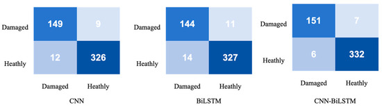 After training completion, a confusion matrix is employed to statistically analyze 492 predicted values from 82 damage conditions in the test set, with the resulting confusion matrix presented in Figure 15. Performance indicators for each neural network are calculated and are shown in Table 5. Figure 15 reveals that CNN, BiLSTM, and the combined CNN-BiLSTM exhibit different recognition accuracies. Specifically, CNN misclassified 21 data samples, while BiLSTM misclassified 26 data samples, demonstrating relatively low recognition accuracy. The combined CNN-BiLSTM model misclassified only 13 data samples, showing recognition errors significantly lower than those of the individual CNN or BiLSTM models.