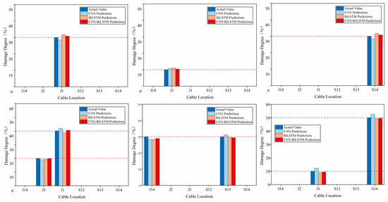 The results indicate that the CNN model achieved 95.77% accuracy for damage location identification, while the BiLSTM model achieved 94.96% accuracy for damage location identification. The combined CNN-BiLSTM model demonstrated superior performance with 97.38% accuracy for damage location identification. The proposed model achieves higher accuracy for damage location identification compared to the other two models. Based on the accuracy rates and confusion matrix results, the combined CNN-BiLSTM neural network model shows superior performance in predicting damage locations compared to individual CNN or BiLSTM models, while also providing relatively precise assessments of damage severity in affected cables. Analysis of the test dataset revealed that cases where damage locations are not identified were primarily concentrated under 10% damage conditions, with the maximum damage degree for cables incorrectly classified as undamaged reaching 13%. Figure 16 presents the recognition accuracy of three neural network models across different damage degree. The results demonstrate that the combined CNN-BiLSTM model exhibits superior recognition accuracy for both single and double damage scenarios when compared to standalone CNN or BiLSTM models.
