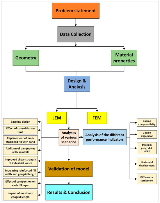 A feasibility study for the expansion of landfill involves industrial waste was conducted as part of the conceptual study to assess how the sensitivity of variations affects the critical factors, i.e., horizontal displacements, vertical settlements, strain in HDPE and geogrid, and the alignment and compressibility of gabions. The different scenarios investigated include the effect of consolidation time, the impact of compaction on each layer, the use of banquets on each side, variations in cohesion (c) and friction angle (ϕ) of industrial waste. Additionally, the study compares the use of two different types of fill materials. The assessment, conducted in accordance with Eurocode 7 and related guidelines. The complete research methodology is illustrated in Figure 1 as shown below.