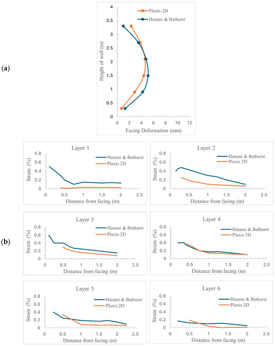 (a) Facing deformation of the wall along its height. (b) Strain (longitudinal) in %, on different layers of the wall along the length of the geogrid (adapted from our paper [33]).