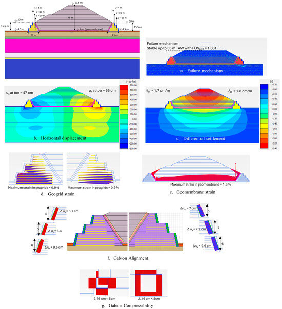 Performance indicators obtained from the analysis of the baseline design: (a) Failure mechanism, (b) Horizontal displacement at the toe, (c) Differential settlement under the reinforced fill structure, (d) Geogrid strain, (e) Geomembrane strain, (f) Gabion alignment, (g) Gabion compressibility.