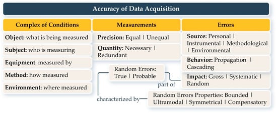 The construction of a GDT relies on data collected under a set of interrelated conditions (“complex of conditions”): the object (what is measured), the subject (who measures), equipment (measured by), method (how measured), and environment (where measured). Optimizing these conditions enhances data accuracy, while suboptimal conditions increase the likelihood of errors. During geometry updates, individual elements can be adjusted, but full consistency cannot be guaranteed. Figure 1 illustrates the main factors influencing data acquisition accuracy, including the complex of conditions, measurements, and error types.