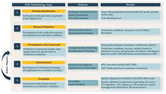 The research gap was identified through a systematic literature review, consultation with field experts, and case study analysis, and it is formalized as the lack of a structured, long-term usable approach for verifying the geometric component of Digital Twins, particularly those derived from photogrammetry. This need was also highlighted in a previous review focusing on updating geometric parameters for built assets []. Prior research consistently emphasizes the essential requirement for geometric models to accurately represent the state of their physical counterparts [,,,,]. Therefore, the verification process must ensure that a newly created model maintains—or, ideally, improves—quality compared to the reference model, thereby making it suitable for subsequent updating. Consequently, a reliable geometric verification approach is critical for twinning and updating processes.