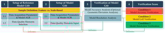 - Three verification conditions were established based on [,] to evaluate model accuracy, resolution, and LoD. These conditions function as decision rules for identifying whether a model’s quality is maintained, improved, or degraded.