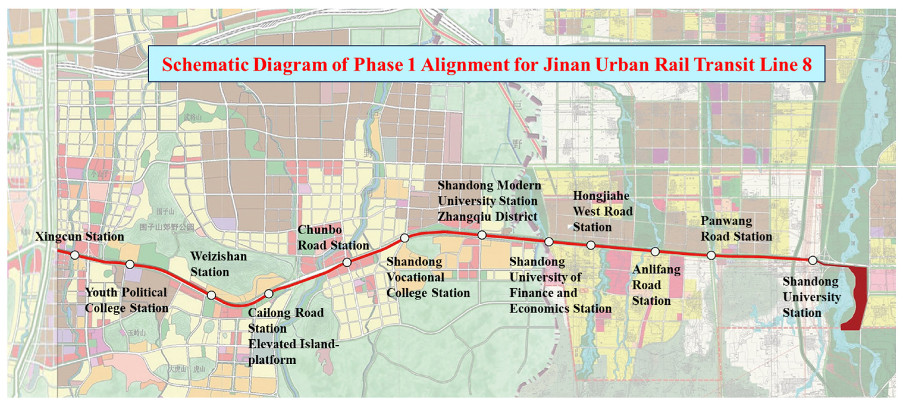 Schematic diagram of the direction of Jinan Urban Rail Transit Line 8 Phase I Project. The hollow circle represents the station, and the solid red line represents the subway line.