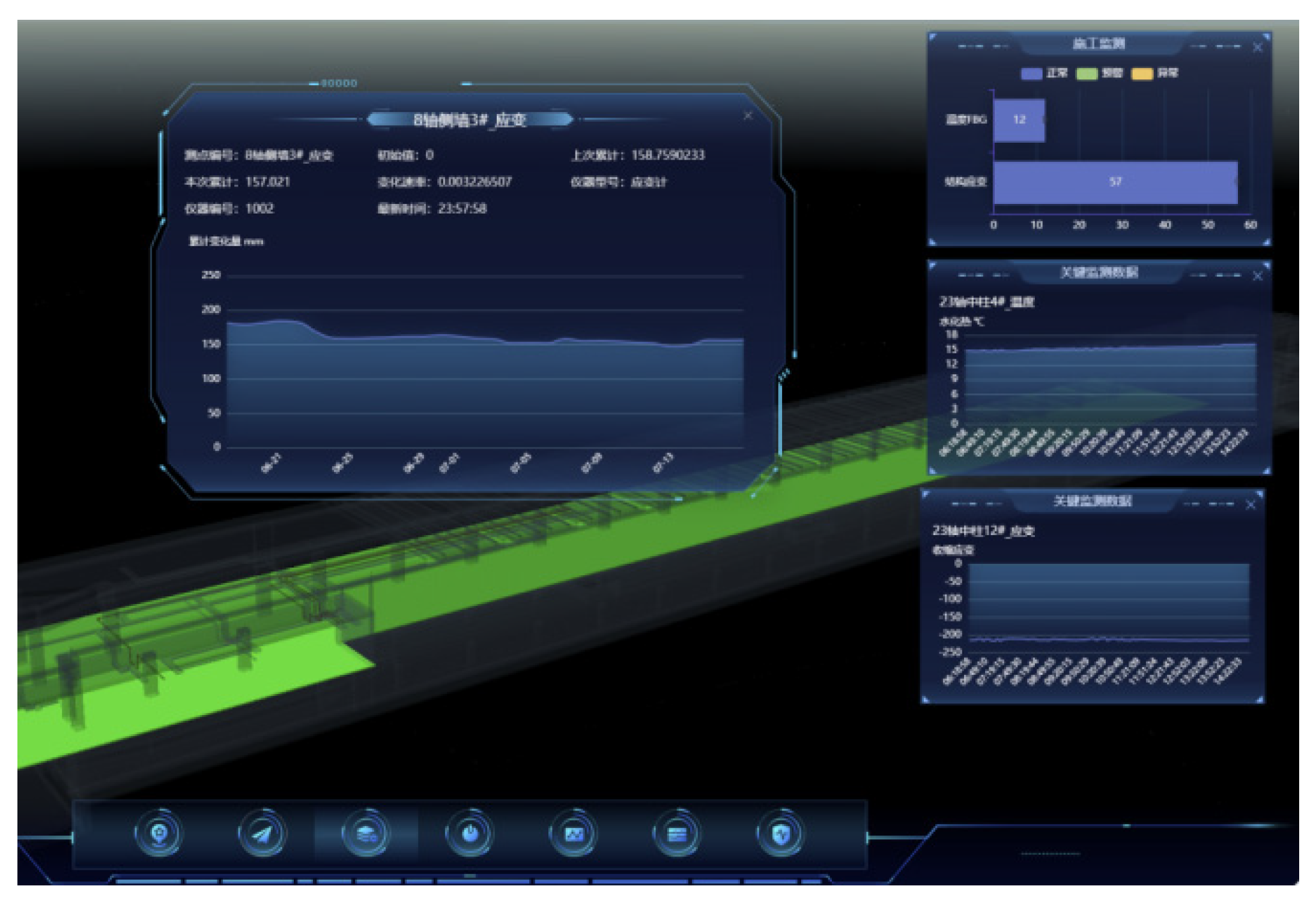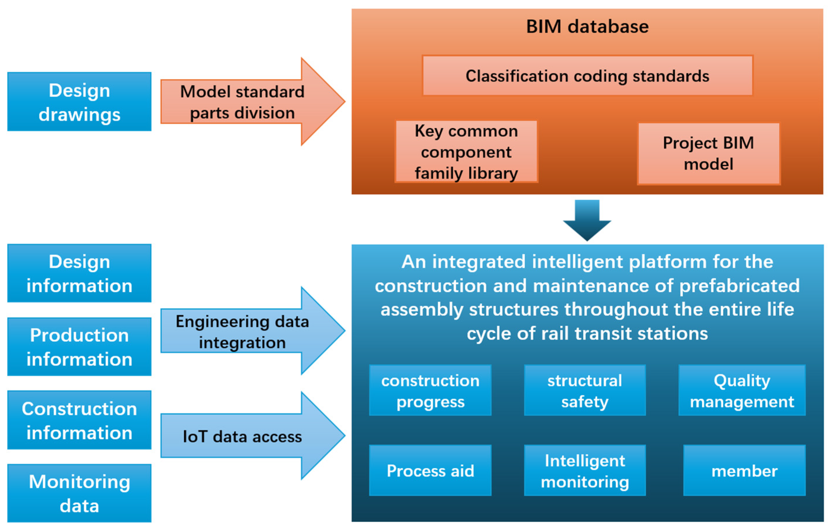 Data fusion technology enables integrated management of multi-disciplinary and multi-service engineering data. The digital twin platform for prefabricated composite stations incorporates IoT-collected monitoring data and other engineering data (e.g., design, production, and construction information). Built-in algorithms analyze these multi-source data to achieve construction progress tracking, structural safety monitoring, quality management, and process-aided design (
