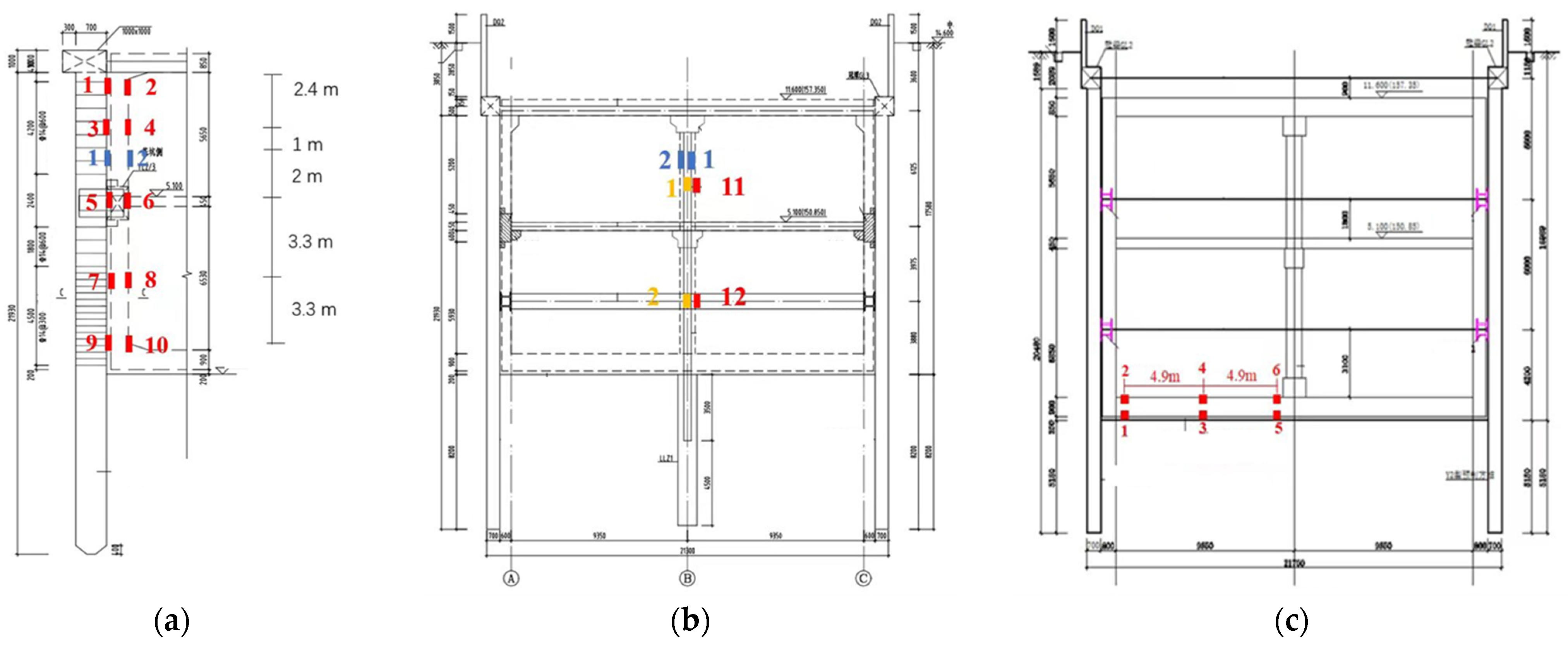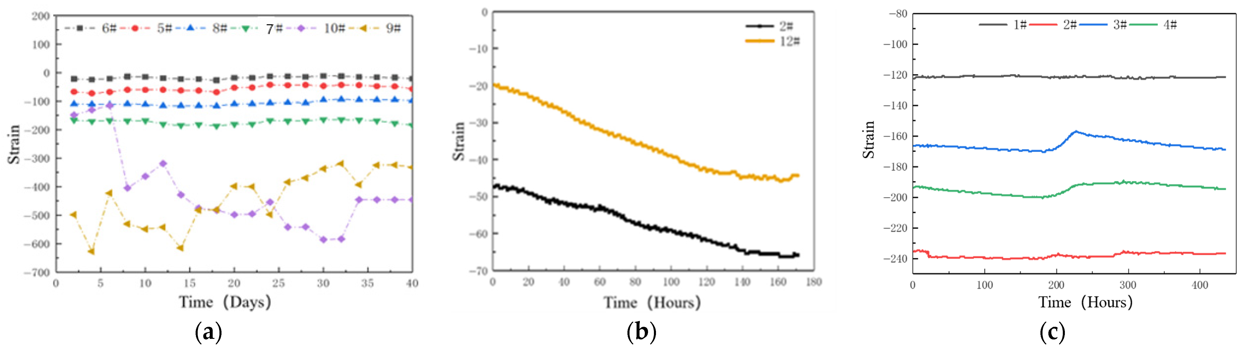 Monitoring data strain curve: (a) side wall; (b) center column; (c) base plate.