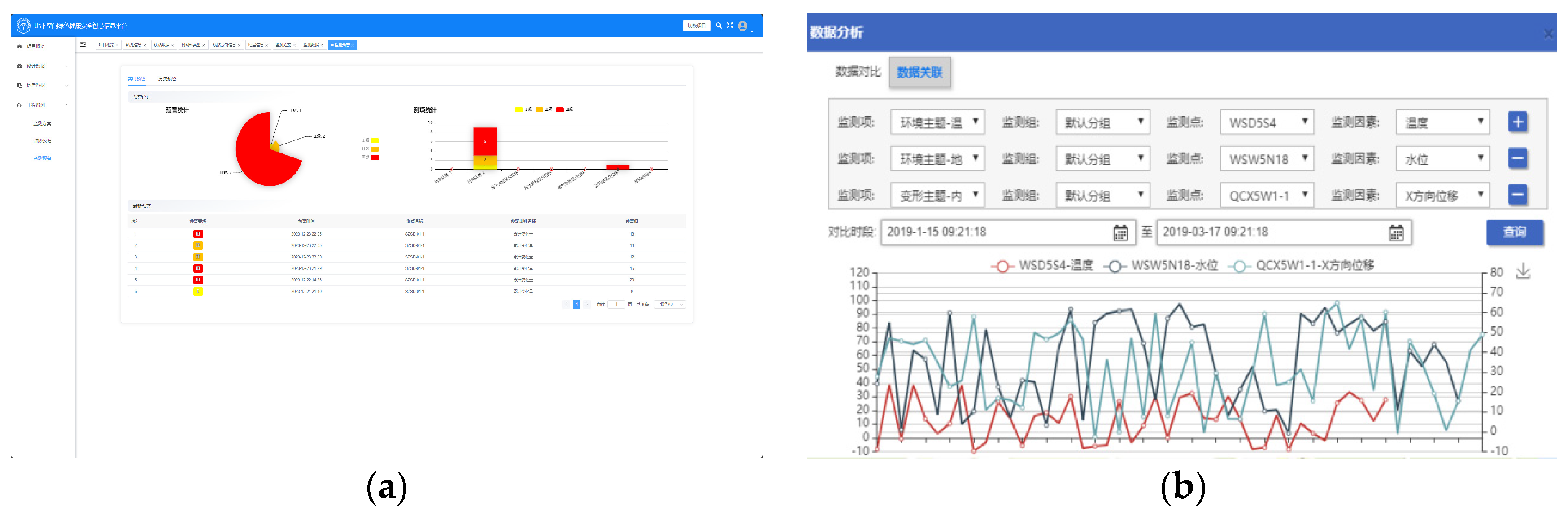 Risk monitoring management: (a) Warning Information Management Interface; (b) Data association analysis.