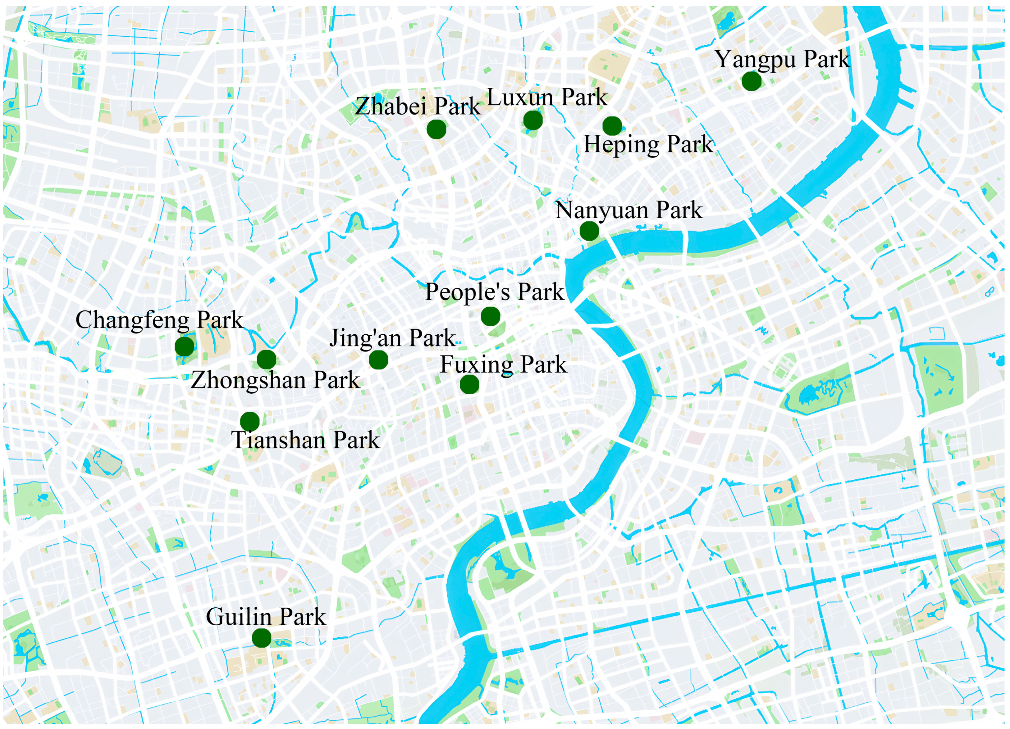 | Landscape Element | Luxun Park | Fuxing Park | Zhongshan Park | Zhabei Park | People’s Park | Jing’an Park | Nanyuan Park | Yangpu Park | Guilin Park | Changfeng Park | Heping Park | Tianshan Park |
