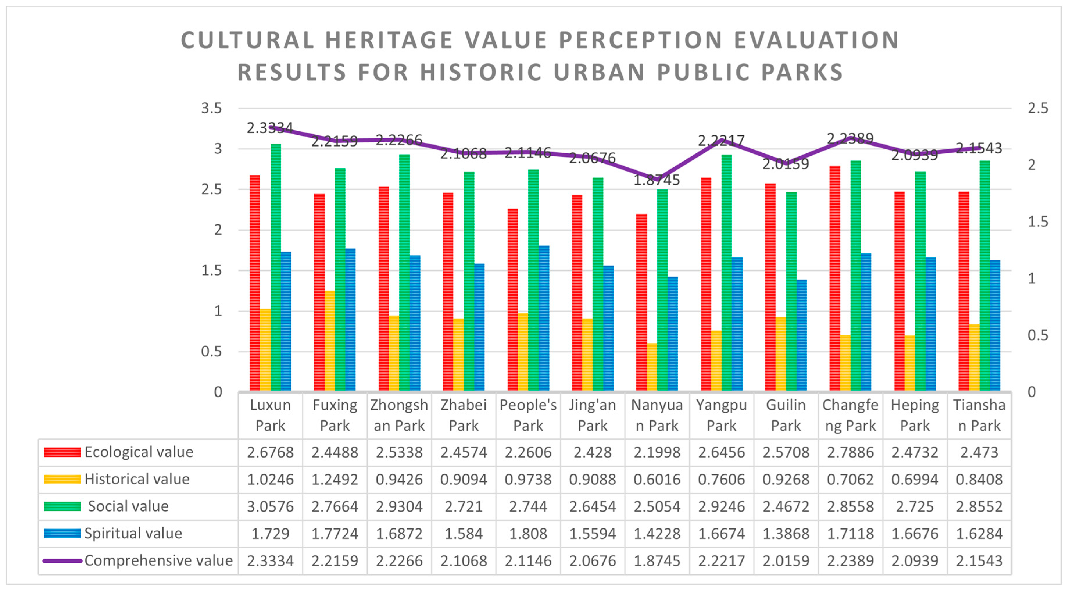 | Heritage Value | Perception Element | Luxun Park | Fuxing Park | Zhongshan Park | Zhabei Park | People’s Park | Jing’an Park | Nanyuan Park | Yangpu Park | Guilin Park | Changfeng Park | Heping Park | Tianshan Park |