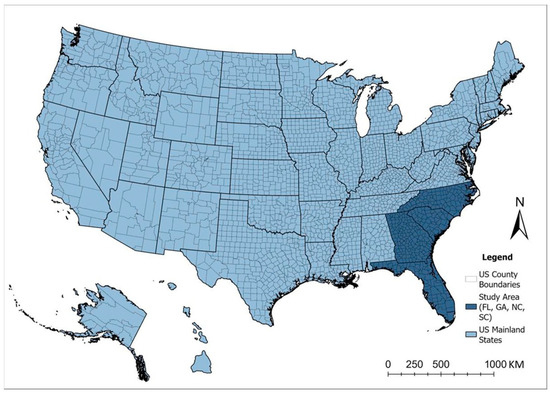Figure 1, This study examines four southeastern U.S. states—Florida, Georgia, South Carolina, and North Carolina. These states were selected because they are characterized by high levels of urbanization and frequent flooding, which makes them ideal areas for assessing the relationship between urban green space vulnerability and flood risk.