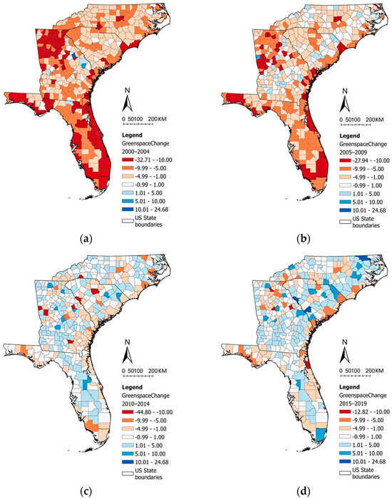 Our spatial analysis reveals that the change in urban green space from 2000 to 2019 was a markedly heterogeneous process across counties in the southeastern United States. Despite a deceleration in the overall rate of loss over time, negative changes dominated large parts of the region, particularly in coastal and low-lying counties prone to recurring flood events. The spatial and temporal variations observed underscore that green space decline is not a uniform process but one shaped by localized environmental and socio-spatial factors.
