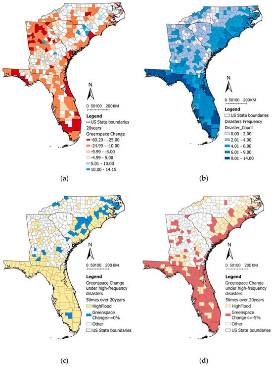 49]. Future research should incorporate higher-resolution data (e.g., census tracts or block groups) to capture finer-scale dynamics and to address potential issues of environmental justice. Moreover, our county-level design cannot establish a one-directional causal chain between flooding and green-space loss; flood impacts are likely concentrated in coastal and low-lying settings, whereas inland effects may be indirect. Future work should couple tract-level analyses with hydrological data (e.g., streamflow records or remote-sensing-based flood-inundation maps) to disentangle direct biophysical damage from post-disaster redevelopment and land-use transition dynamics.