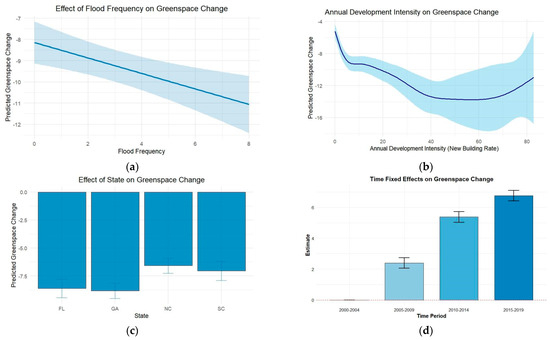 Among the statistically significant factors, flood frequency is a significant and negative linear predictor of the green space change rate (p < 0.01). This coefficient indicates that for each additional presidentially declared flood event, a county’s 5-year green space change rate is expected to decrease by 0.36 percentage points, controlling for other factors.