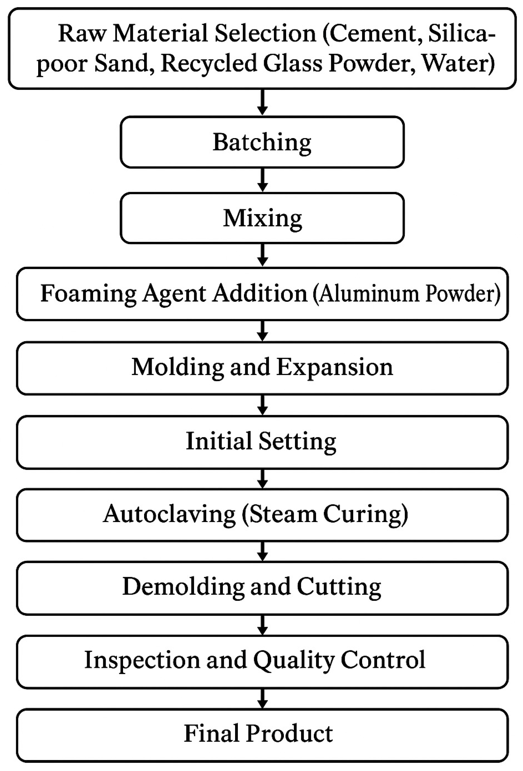 2), calcium oxide (CaO), polyvinyl acetate (PVA) emulsion as a binder that improves foam stability and sand–binder cohesion without affecting cement hydration, aluminum powder as a foaming agent, and water. A commercial foaming agent was initially included in the trials; however, it was subsequently excluded from the procedure after demonstrating negligible influence on the final product properties. The overall process included blending the constituent materials, casting them into lubricated molds, and curing under controlled conditions, during which the aluminum-based foaming reagent ensured pore stability. This enhanced method simultaneously optimized material efficiency and energy consumption, while maintaining the lightweight and insulative properties characteristic of ALC. The steps for ALC production are shown in