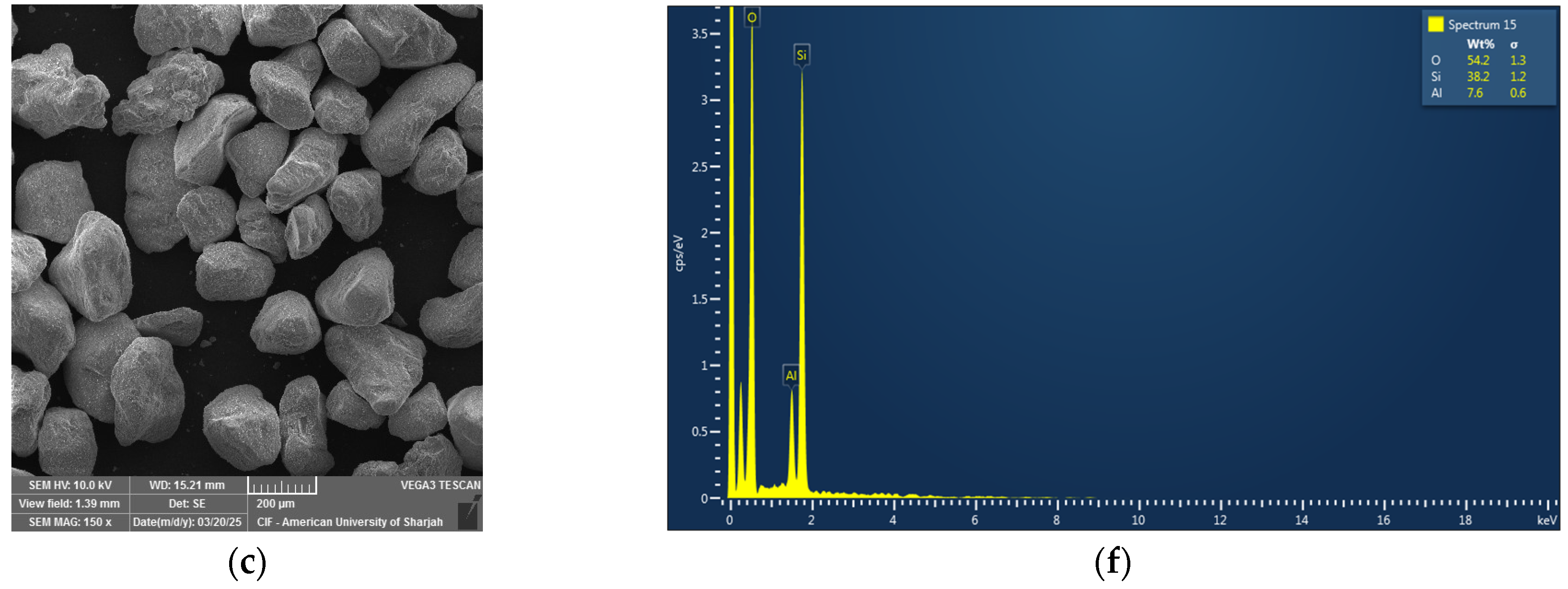 Figure 3d–f present the corresponding EDS spectra, comparing the elemental compositions of the UAE and UK sands. The inclusion of the UK sample provides a silica-rich benchmark for comparison, enabling evaluation of the modified mix’s adaptability to sands of differing purity and geological origins.