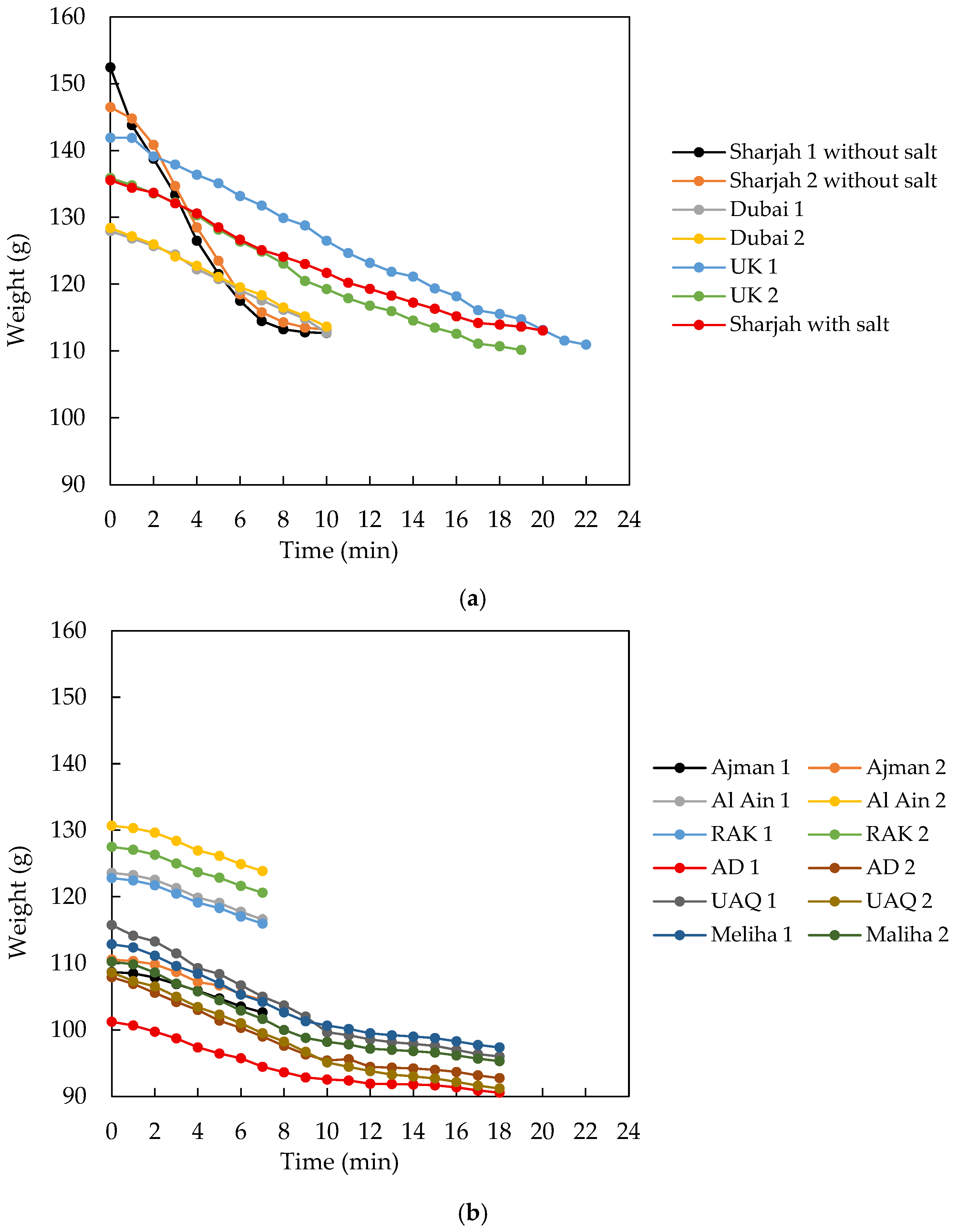 19]. Sharjah 1 and Sharjah 2 samples (without salt) displayed pronounced early mass loss, decreasing from 152.44 g to 143.79 g and from 146.49 g to 144.78 g, respectively, which indicates rapid surface evaporation during the initial stage. Dubai 1 and Dubai 2 samples dried more quickly compared with Sharjah specimens, likely due to local environmental conditions such as higher ambient temperature and lower humidity [
