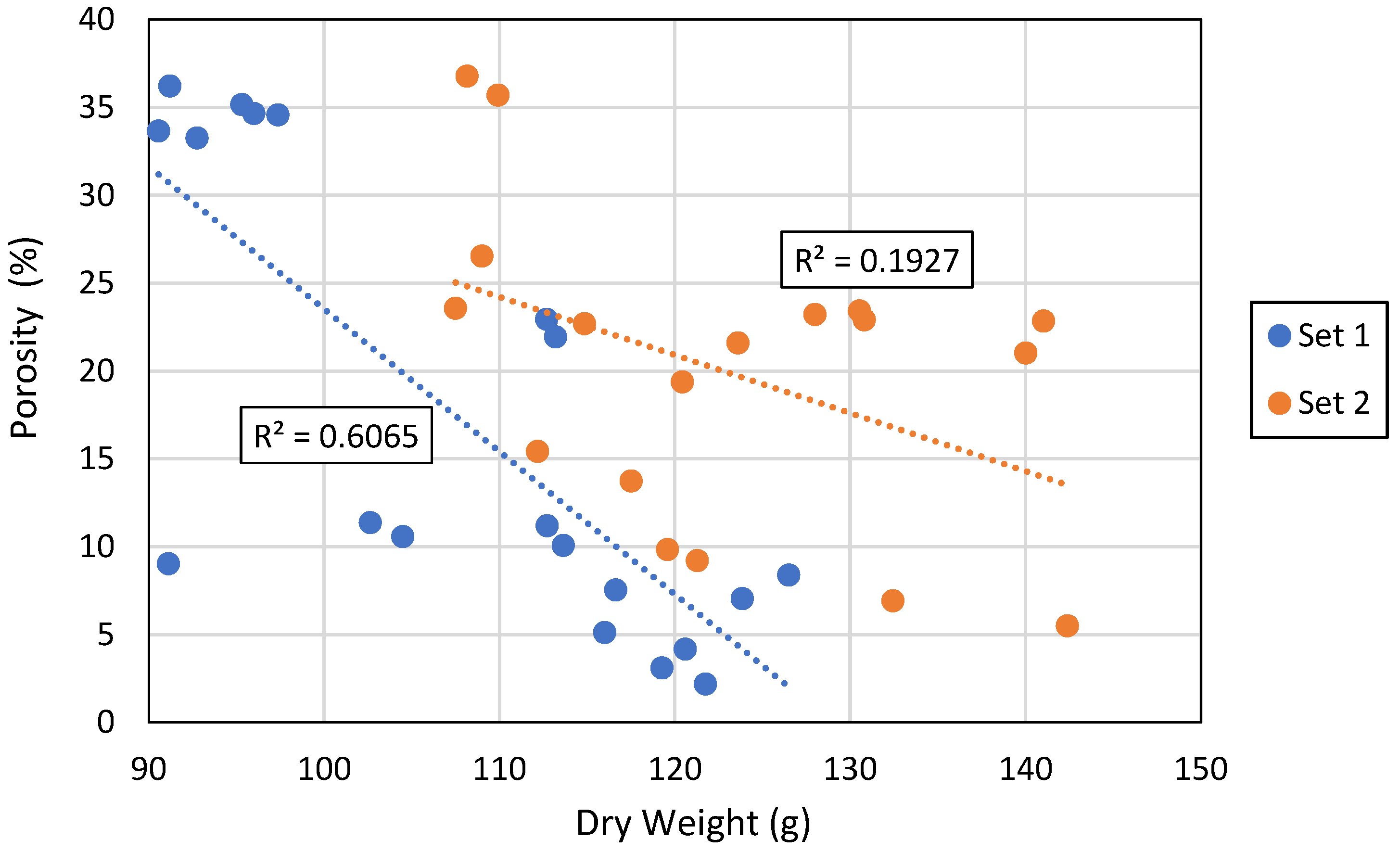 Figure 6 further illustrates the inverse relationship between dry weight and porosity for both Sets 1 and 2. A strong negative correlation (R