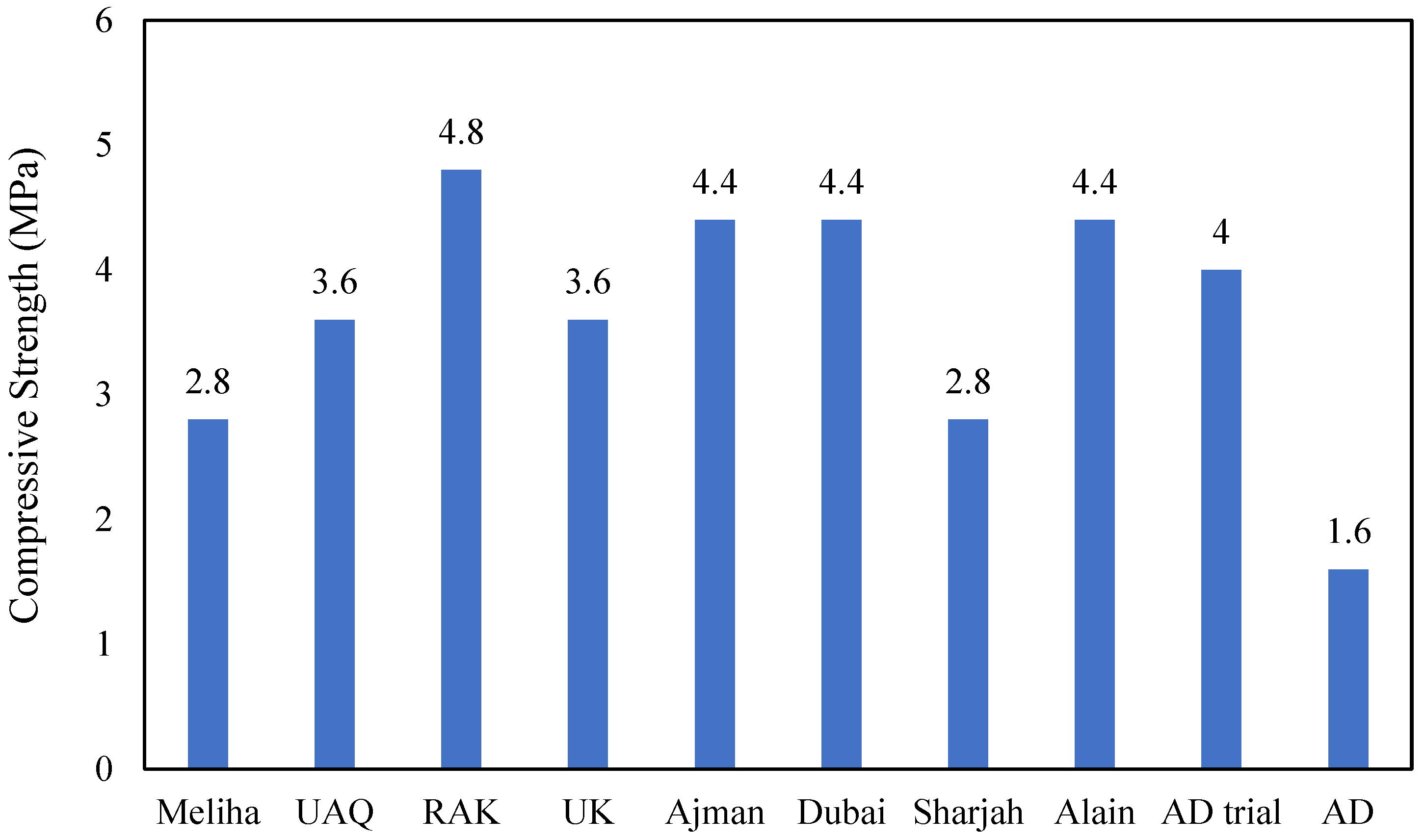 The foam concrete samples demonstrated compressive strength values ranging from 1.6 MPa to 4.8 MPa. Most samples met or exceeded Dubai Municipality’s minimum standards for lightweight non-load-bearing masonry units (average ≥ 3.2 MPa, individual ≥ 2.6 MPa). RAK recorded the highest strength at 4.8 MPa, while Ajman, Alain, and Dubai followed with consistent values of 4.4 MPa. UK samples also demonstrated competitive compressive strength values, consistent with their high silica content and low impurity levels. Their performance further supports the observed correlation between silica enrichment and mechanical enhancement across all regions. Samples such as Mleiha and Sharjah, both revealing 2.8 MPa, were close to the minimum threshold, showing acceptable performance. The ‘cement with detergent’ mixture, developed during the exploratory phase, achieved 4.0 MPa, indicating the feasibility of using alternative foaming agents. A significant observation was the variation between the “AD” and “AD trial” samples. The control AD sample exhibited the lowest compressive strength at 1.6 MPa, whereas the “AD trial”, produced by reducing the aluminum powder content by 0.3 g, achieved a markedly higher strength of 4.0 MPa. This highlights the importance of optimizing aluminum dosage to control pore structure and enhance mechanical performance.