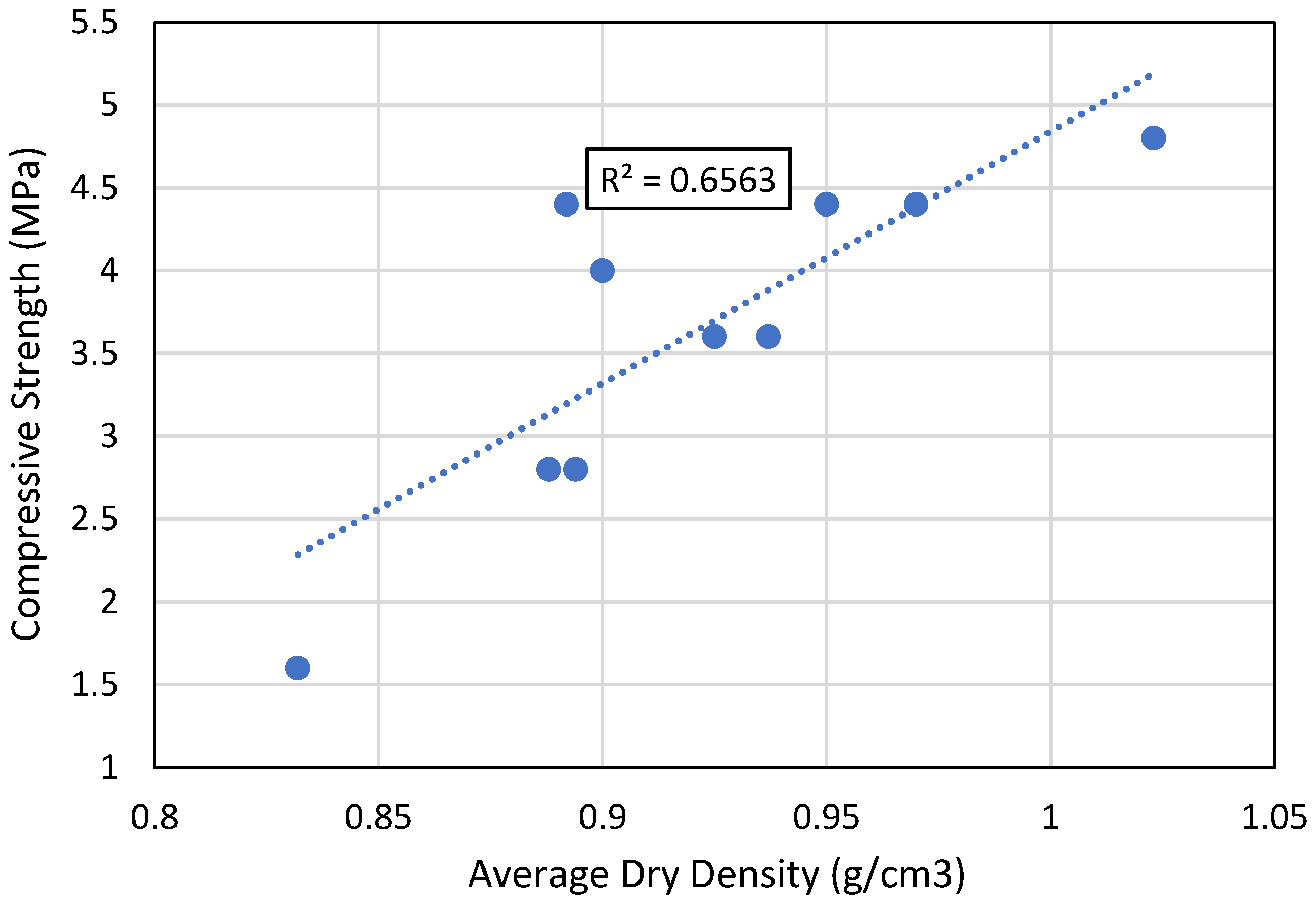 2 = 0.66) is observed, indicating that denser foam concrete samples generally exhibit higher compressive strength. This trend suggests that increased dry density reflects improved particle packing and reduced air-void content, leading to enhanced load-bearing capacity. As addressed in previous studies, i.e., ref. [