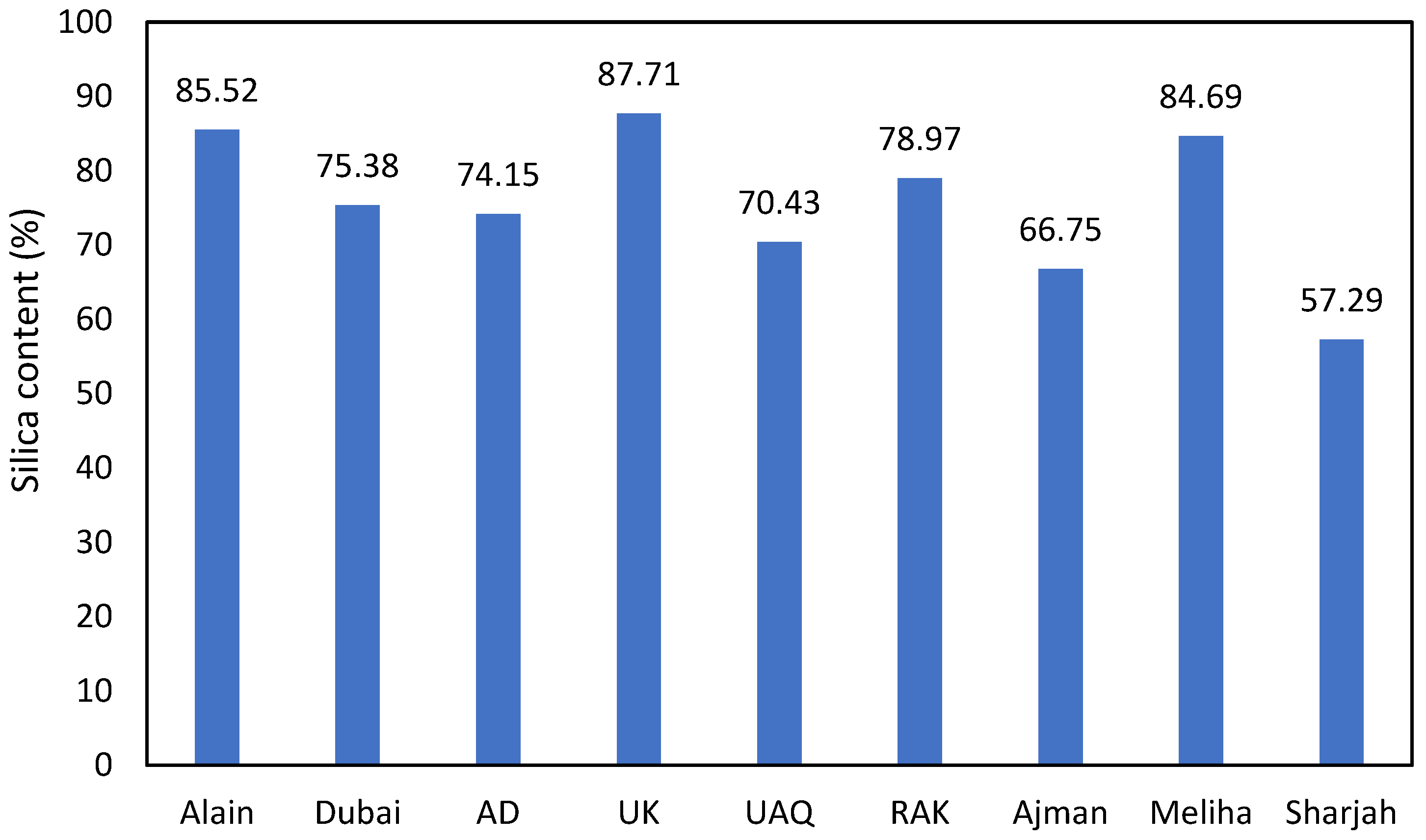 Figure 9 presents the silica content (%) of sand samples collected from various locations, highlighting regional variations in composition.