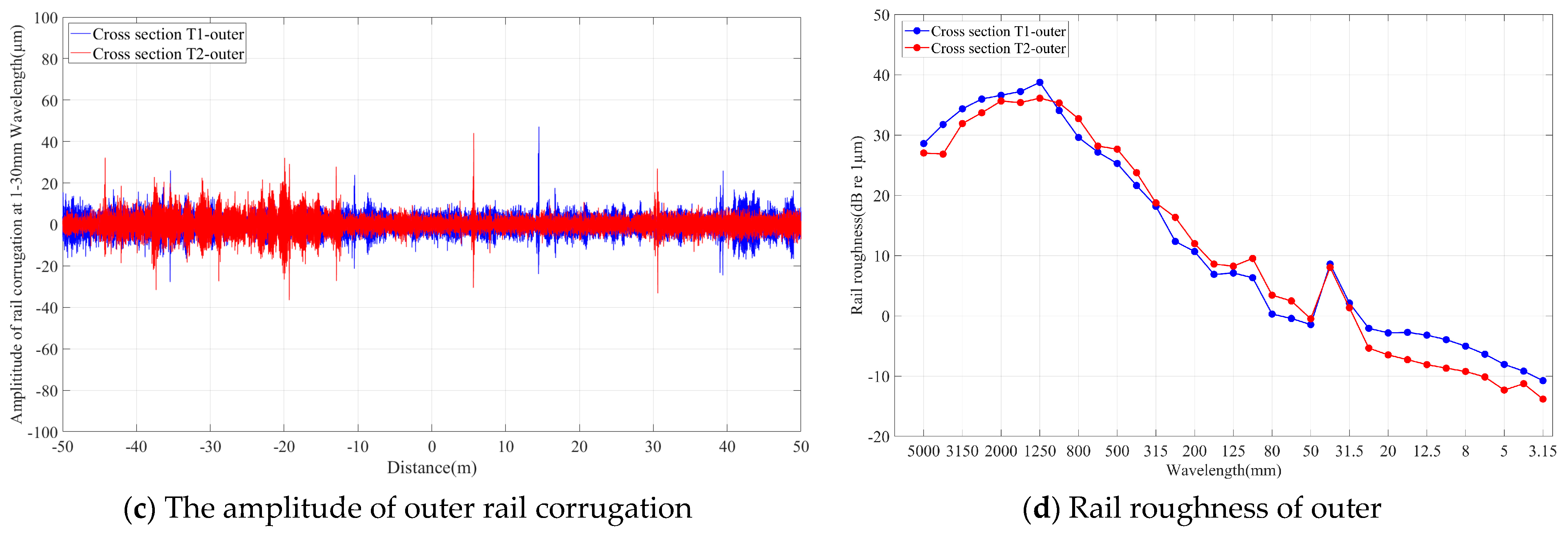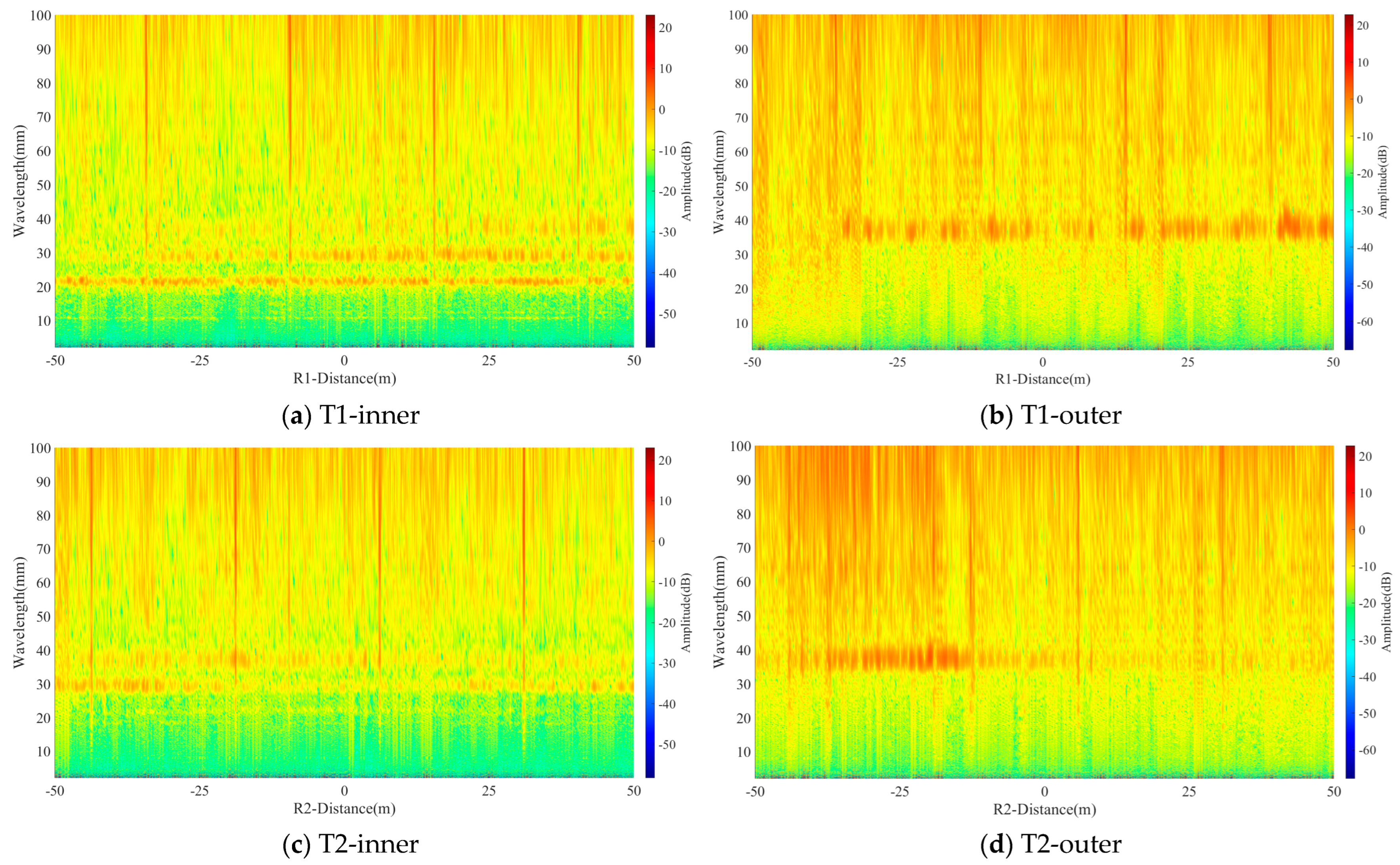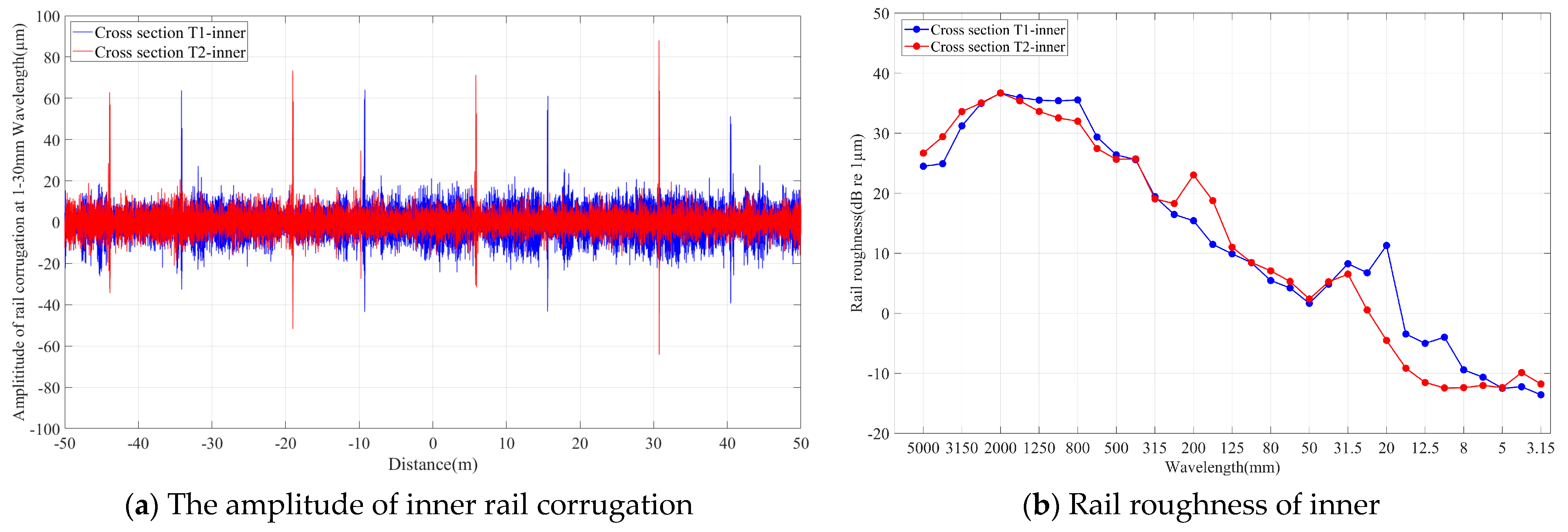 From the results, it can be visually observed that the energy of the 50–100 mm wavelength of the T2 rail cross-section was more abundant compared with that of T1. Moreover, the corrugation with a wavelength of 20 mm on the inner rail of cross-section T1 was the most prominent.