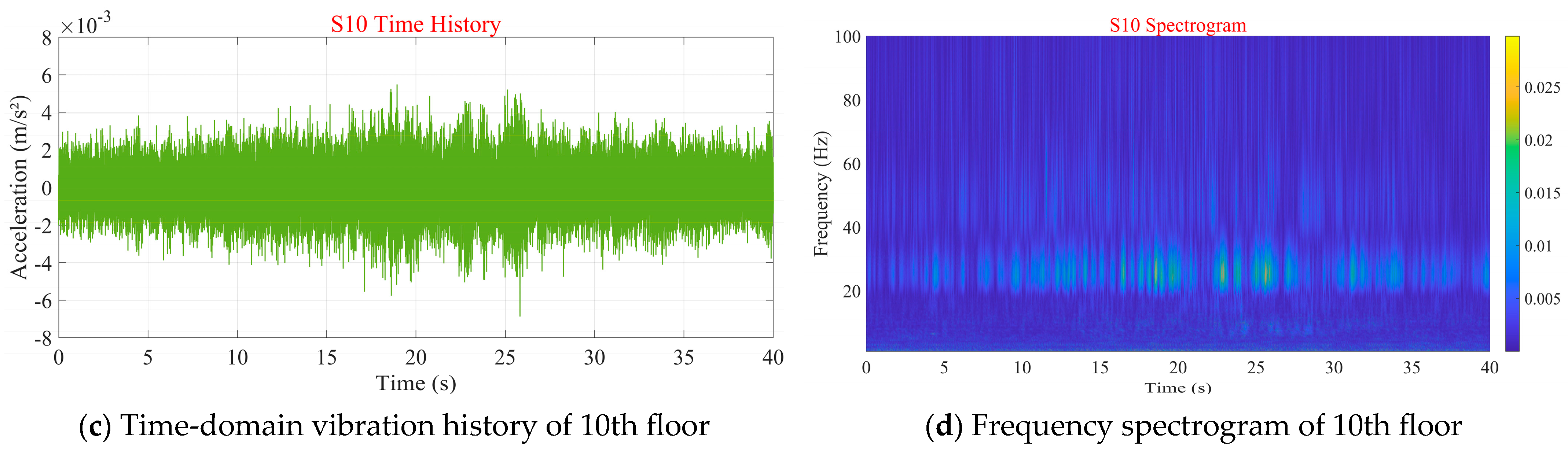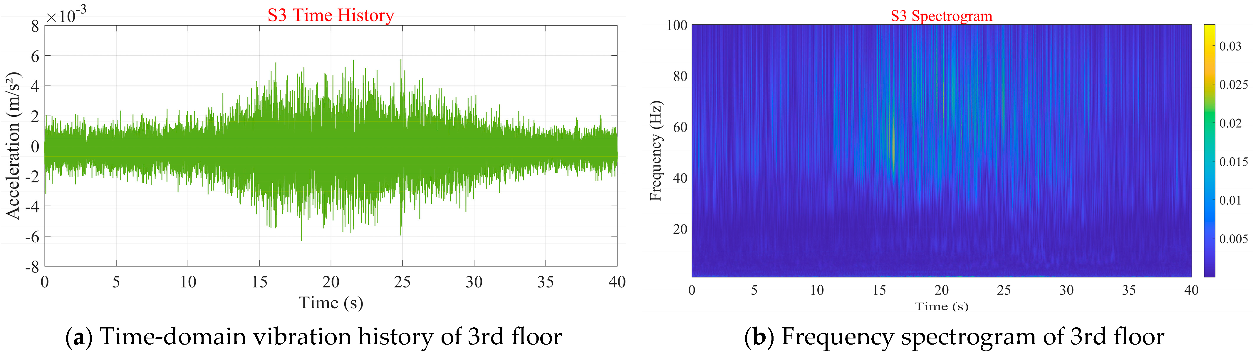 2. The vibration amplitudes of the two points did not vary significantly. Judging from the frequency-domain plot (the light-band representation), the vibration energy of S3 was distributed over a relatively wide frequency band, with the main frequency range being 40–100 Hz. In contrast, the vibration of S10 was relatively concentrated, and its dominant frequency band was 60–80 Hz.