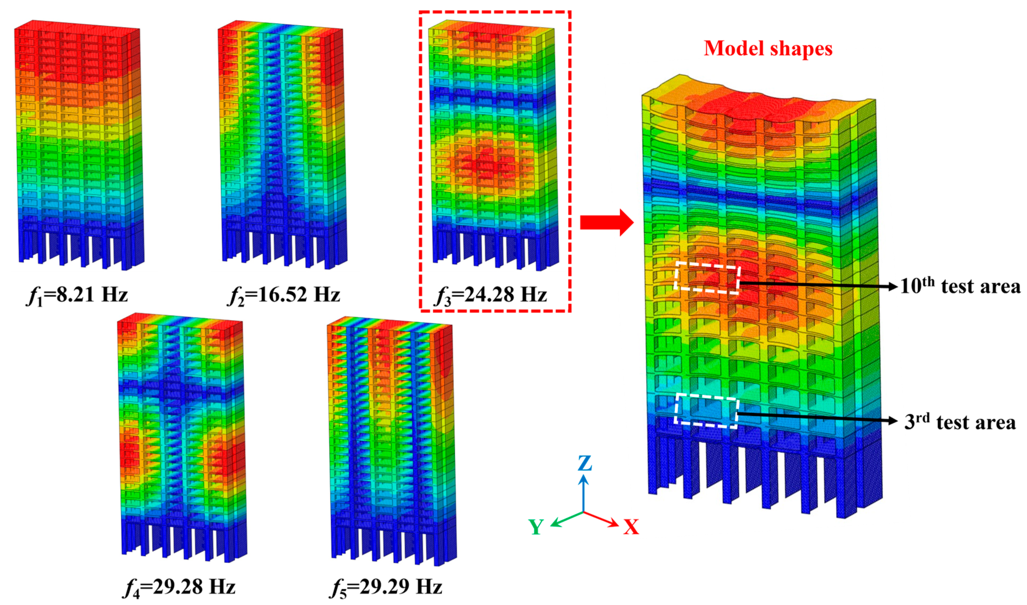 Further analysis of the vibration pattern at this frequency revealed that the mode shape was characterized by localized warping deformations of the floor slabs. Such deformation behavior was primarily observed between the 8th and 13th floors as well as at the topmost level of the building. These observations indicate that compared with the 3rd floor, the 10th floor exhibited a higher sensitivity to vibrations occurring near 24.28 Hz, thereby increasing the possibility of local resonance in the floor structure. This is one of the reasons for the significant amplification of vibrations at 25 Hz on the 10th floor.